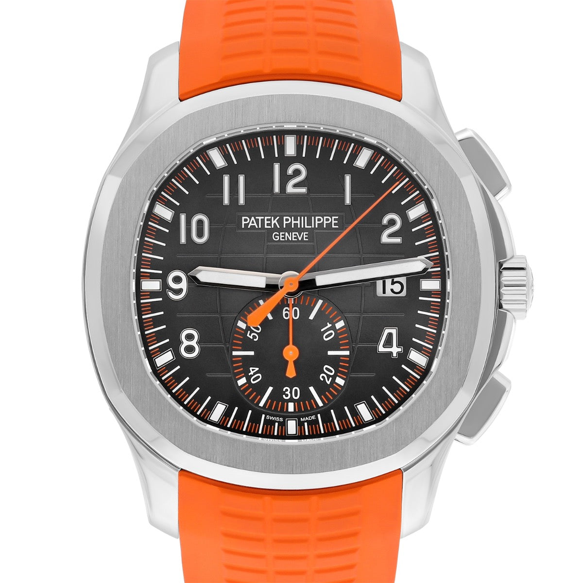 The black embossed dial displays a contrasting orange chronograph and gold applied numerals. It is protected by a sapphire-crystal case back and comes on an orange rubber bracelet with an Aquanaut fold-over clasp.