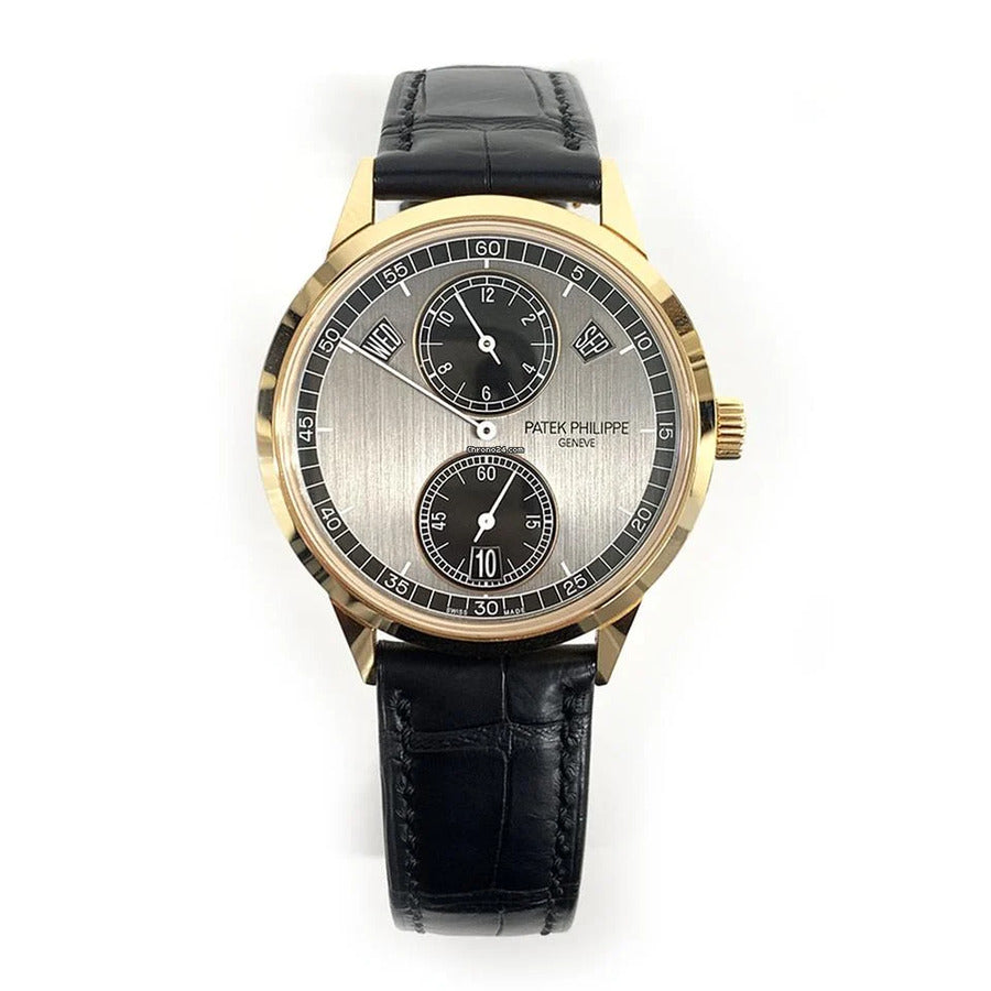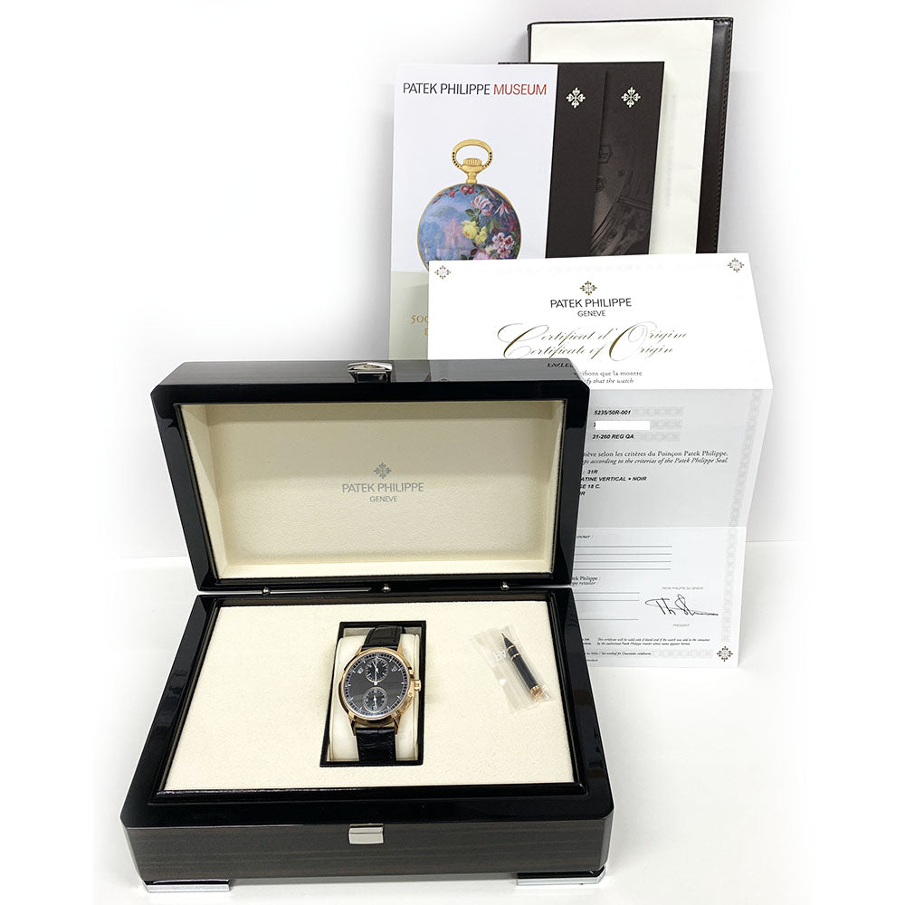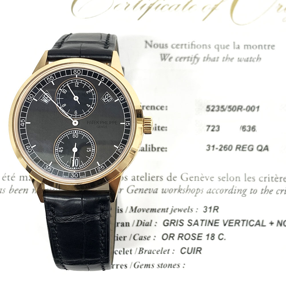 The Patek Philippe Annual Calendar 5235/50R-001 40mm 18kt rose gold case with a black (alligator) leather strap. Fixed 18kt rose gold bezel. Grey dial with silver-tone central minute hand. Arabic numeral minute markers (at 5 minute intervals). Minute markers around the outer rim. Two sub-dials displaying hours and seconds. Dial Type: Analog. Date display at the 6 o'clock position. Day of the week display at the 10 o'clock position.