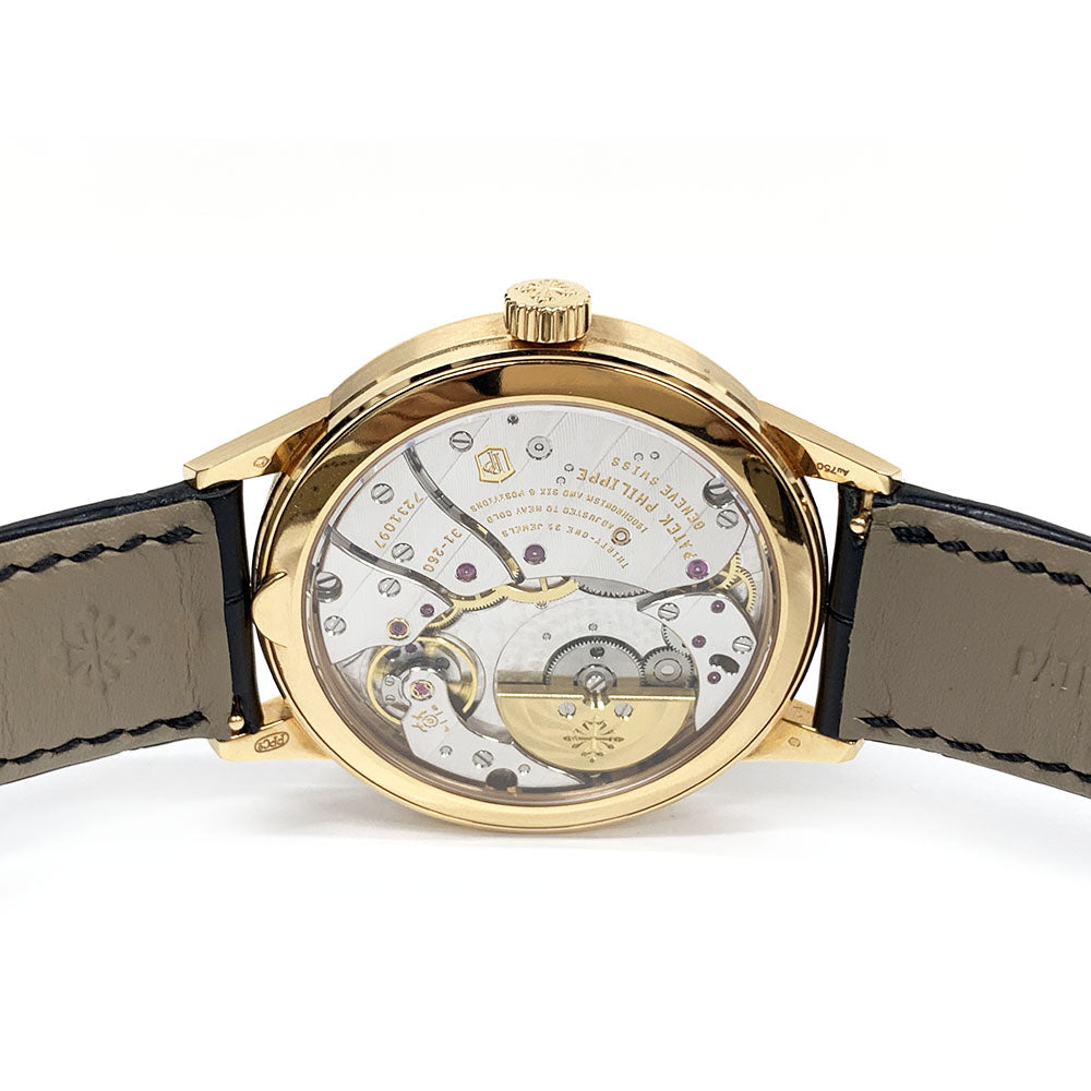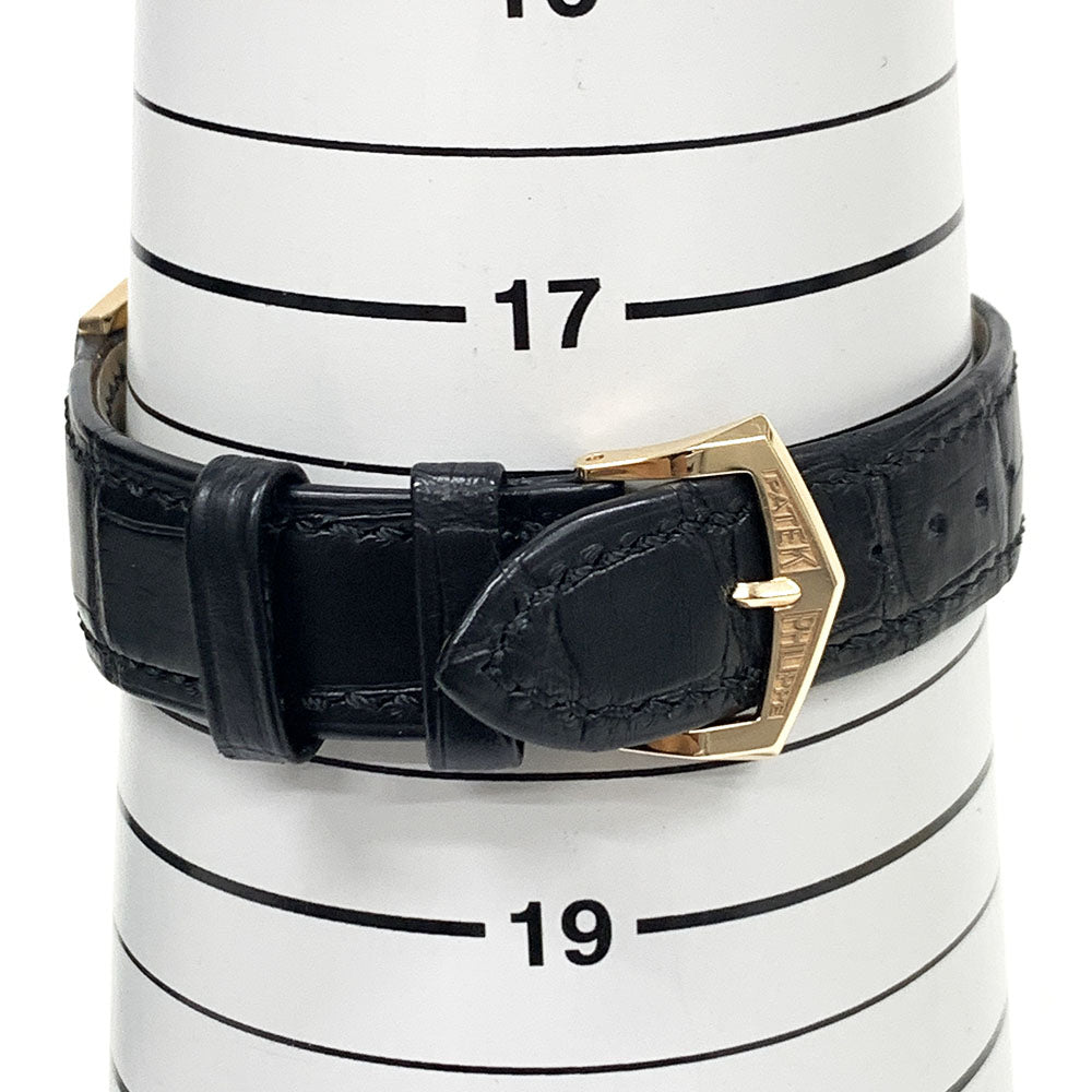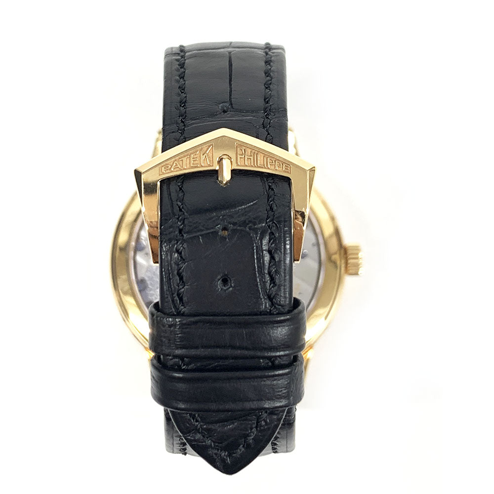 Month display atthe 2 o'clock position. Patek Philippe calibre 31-260 REG QA automatic movement, containing 31 Jewels, composed of 313 parts, bitting at 23040 vph, and has a power reserve of approximately 48 hours. Scratch resistant sapphire crystal. Screw down crown. Transparent case back. Round case shape. Case size: 40.5 mm. Case thickness: 10 mm. Tang clasp. Water resistant at 30 meters / 100 feet. Functions: month, date, day, hour, minute, second, annual calendar. Luxury watch style. Watch label: Swiss made.