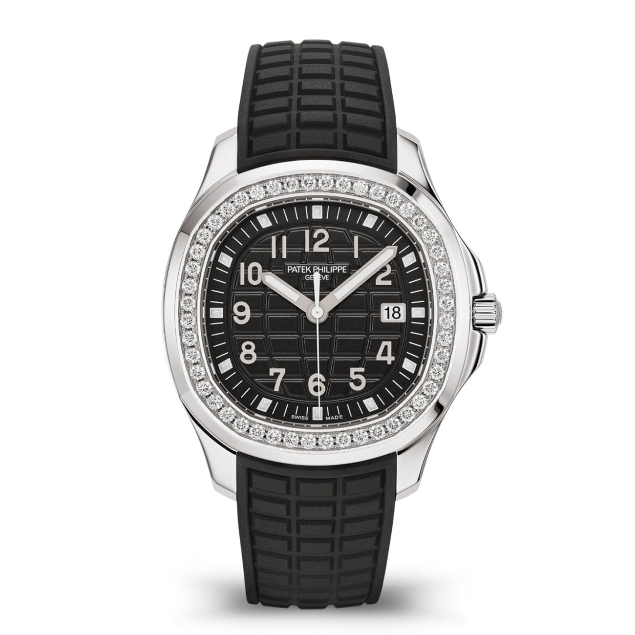 The Patek Philippe Aquanaut Luce in stainless steel blends modern design with refined craftsmanship. Its 38.8 mm rounded octagonal case features polished and satin finishes, while the black dial showcases the signature Aquanaut pattern with gold-applied numerals. The bezel is set with 48 diamonds (~1.11 ct), adding a touch of luxury.