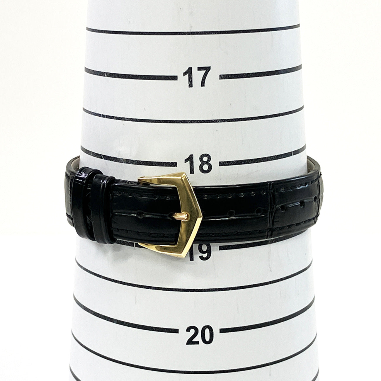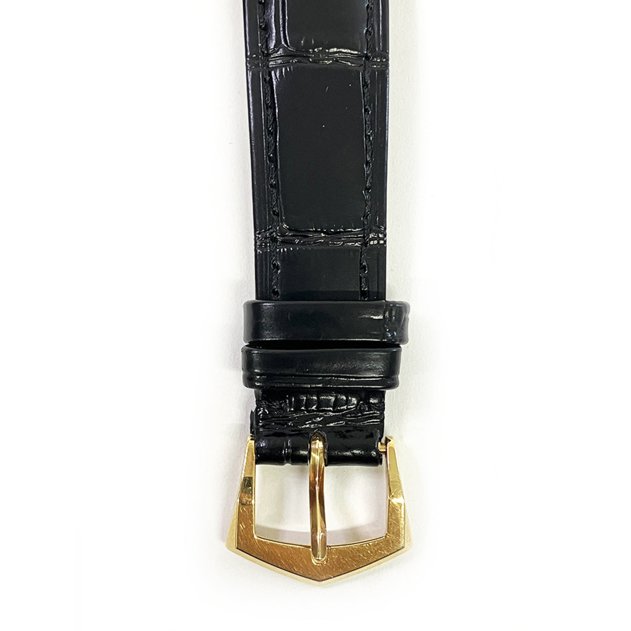 Gold-tone 18k yellow gold case with a black alligator leather strap. Fixed gold-tone 18k yellow gold bezel. White dial with Roman numeral hour markers. Dial Type: Analog. Hand wind movement. Scratch resistant sapphire crystal. Pull / push crown. Solid case back. Round case shape. Case size: 33 mm. Tang clasp. Functions: hour, minute. Dress watch style. Watch label: Swiss Made.