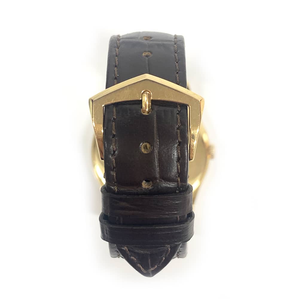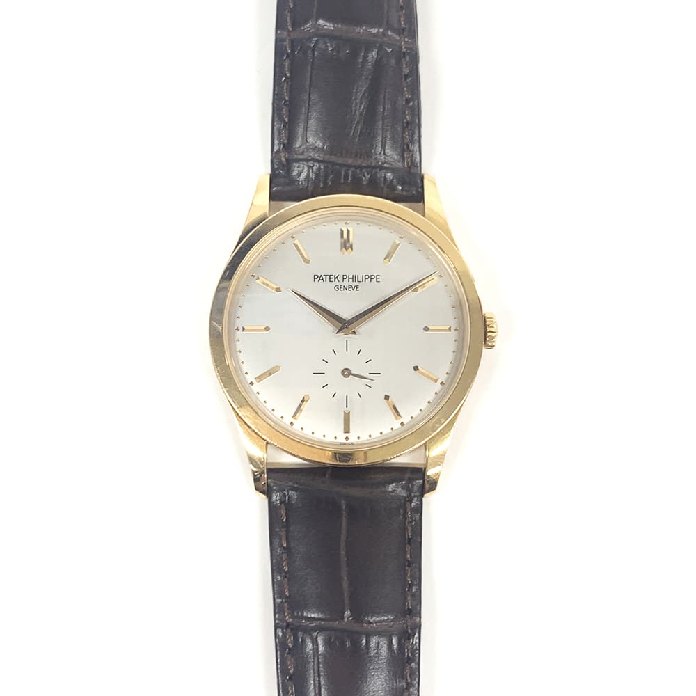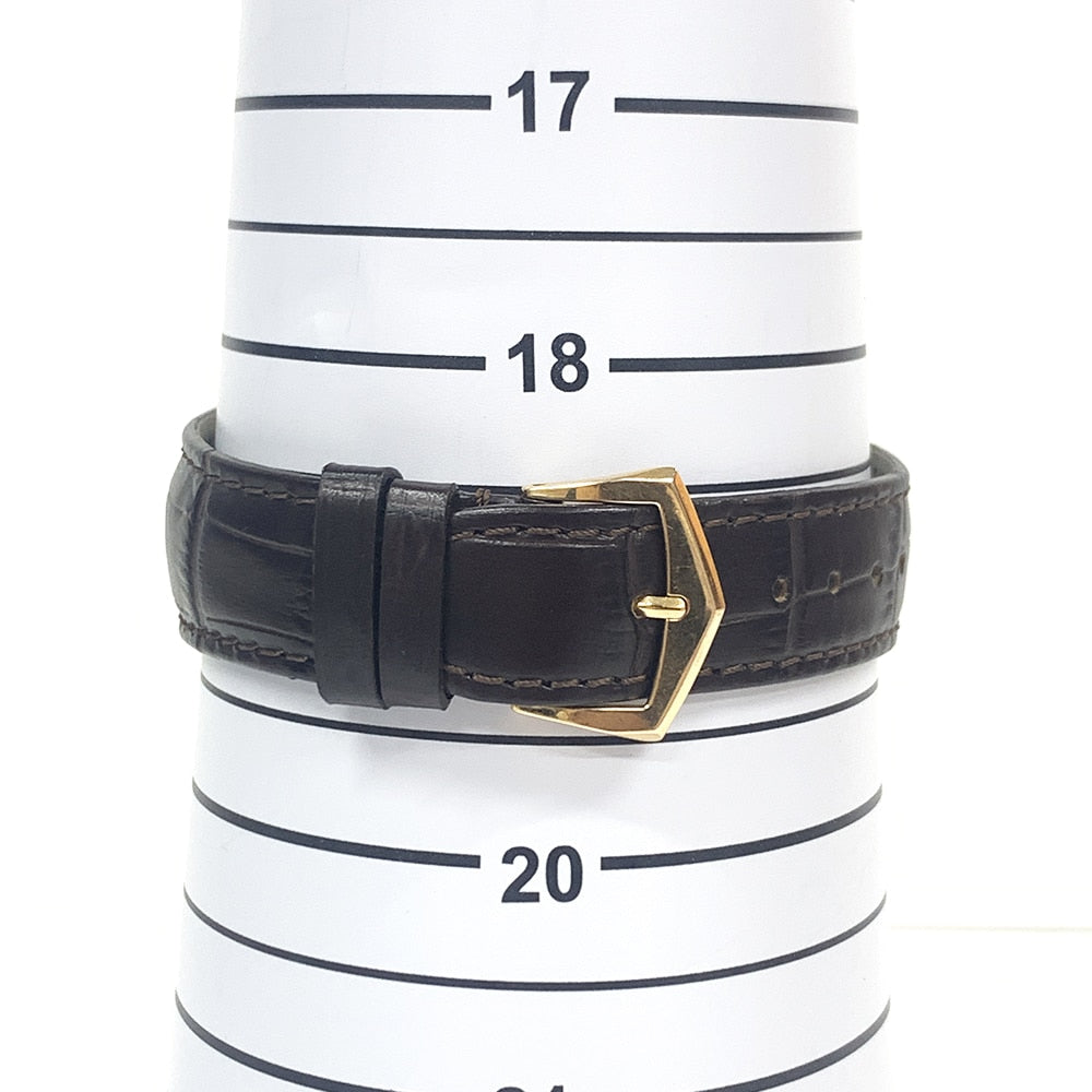 Pull / push crown. Solid case back. Round case shape. Case size: 37 mm. Case thickness: 8 mm. Band width: 20.3 mm. Band length: 8 inches. Tang clasp. Water resistant at 30 meters / 100 feet. Functions: hour, minute, small second. Calatrava Series. Luxury watch style.