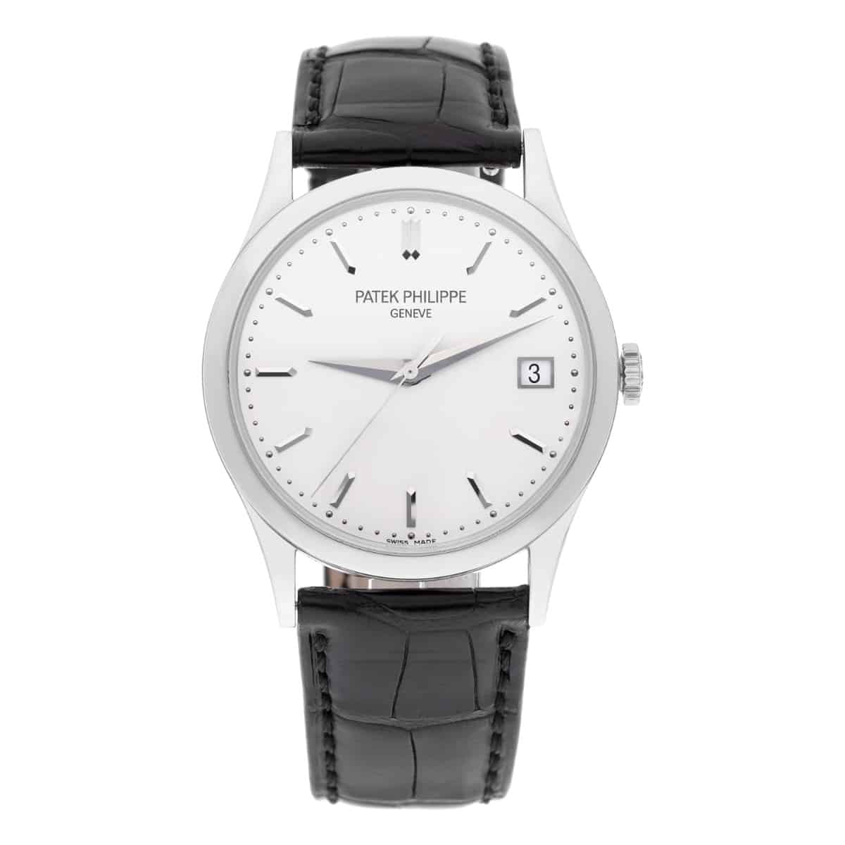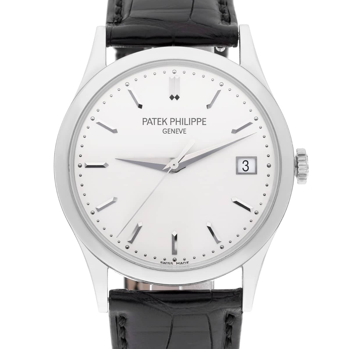 Patek Philippe 5296G-010 Calatrava Silver Dial 18kt White Gold with a black alligator leather strap 5296G-010 Fixed 18kt white gold bezel. Silver dial with white gold hands and index hour markers. Minute markers around the outer rim. Dial Type: Analog. Date display at the 3 o'clock position. Automatic movement with a 45-hour power reserve. Scratch resistant sapphire crystal. Pull / push crown. Sapphire case back. Case diameter: 38 mm. Case thickness: 8.6 mm. Round case shape. Band width: 20 mm. Band length: 8 inches. Tang clasp. Water resistant at 25 meters / 80 feet. Functions: date, hour, minute, second.