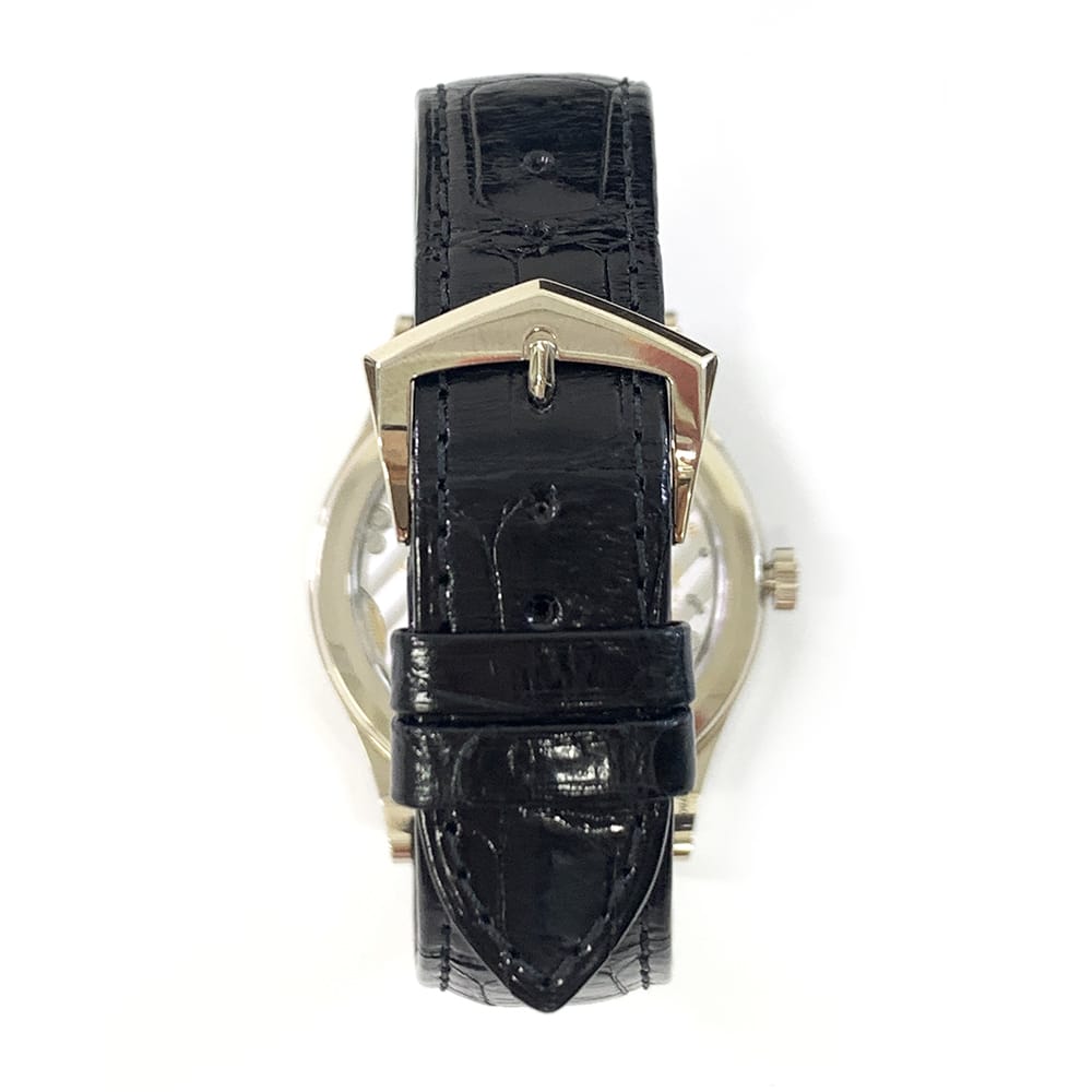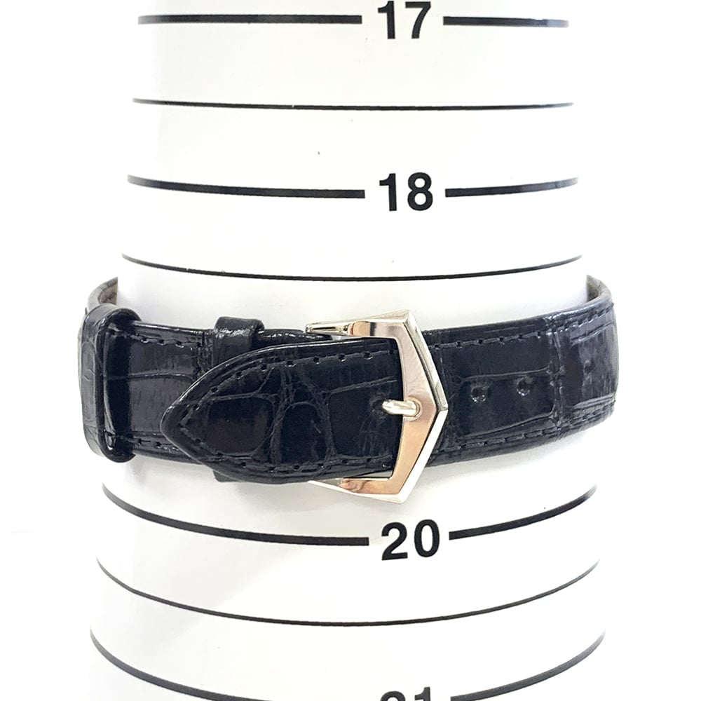 Bracelet: Alligator leather with square scales, shiny black. Prong buckle.
