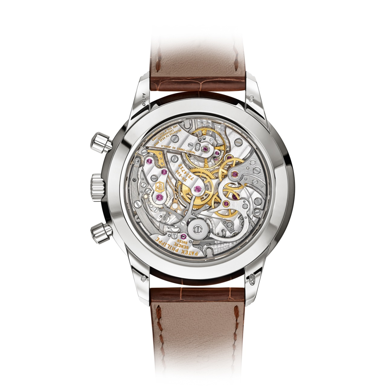 The Patek Philippe vintage-inspired chronograph features a stunning rose-gilded opaline dial with luminescent gold numerals and syringe hands, powered by the advanced CH 29-535 PS manual-wound movement with six patented innovations. Housed in a 41mm white gold case with a sapphire case back, it includes a tachymeter scale, small seconds at 9 o'clock, and a 30-minute counter, paired with a hand-stitched chocolate brown alligator strap. A perfect blend of classic elegance and haute horology.