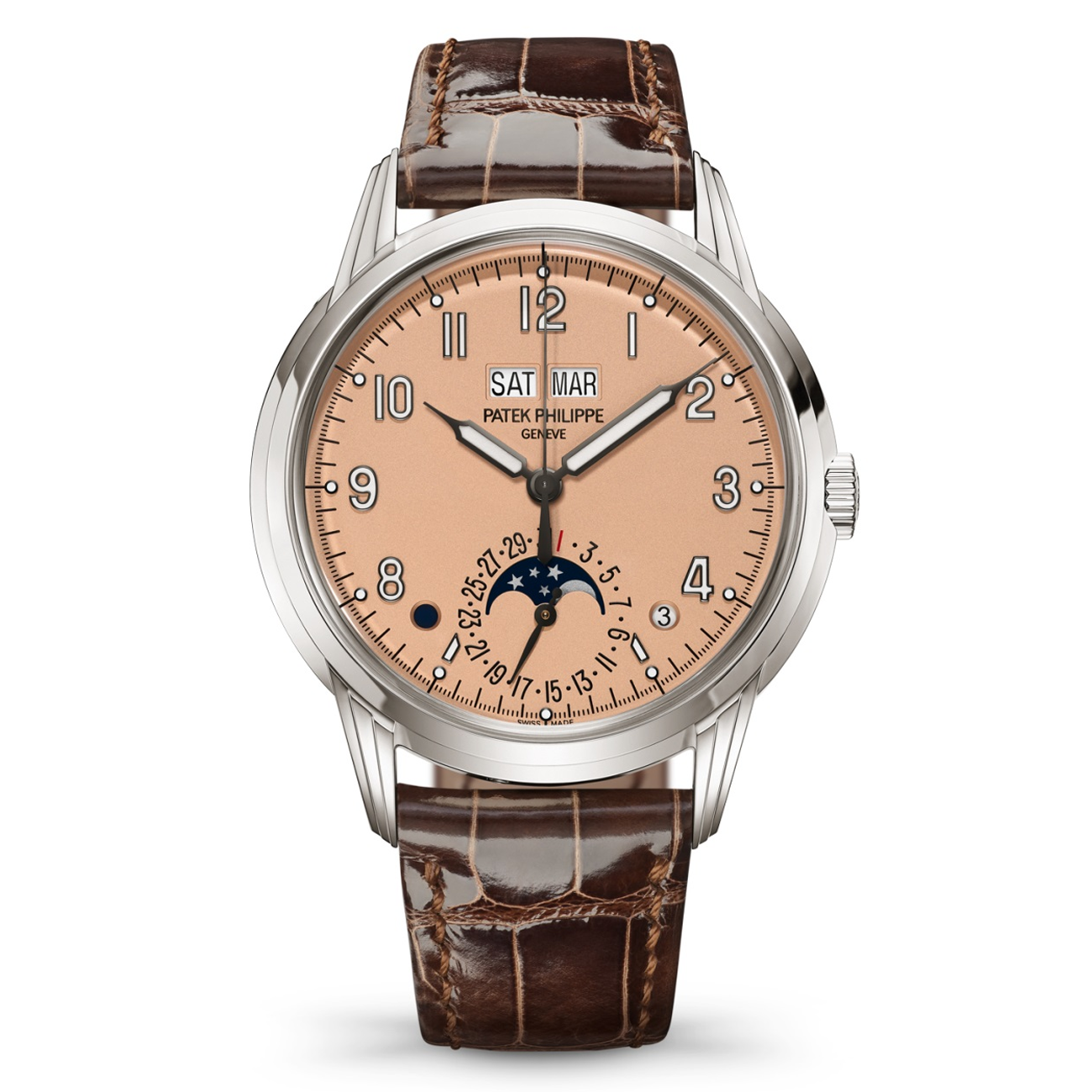 The rose-gilt opaline dial has charcoal gray gold numerals with luminescent coating. Paired with a hand-stitched chocolate brown alligator strap, it offers a classic yet intricate design, water-resistant to 30m. A true masterpiece of Grand Complications.
