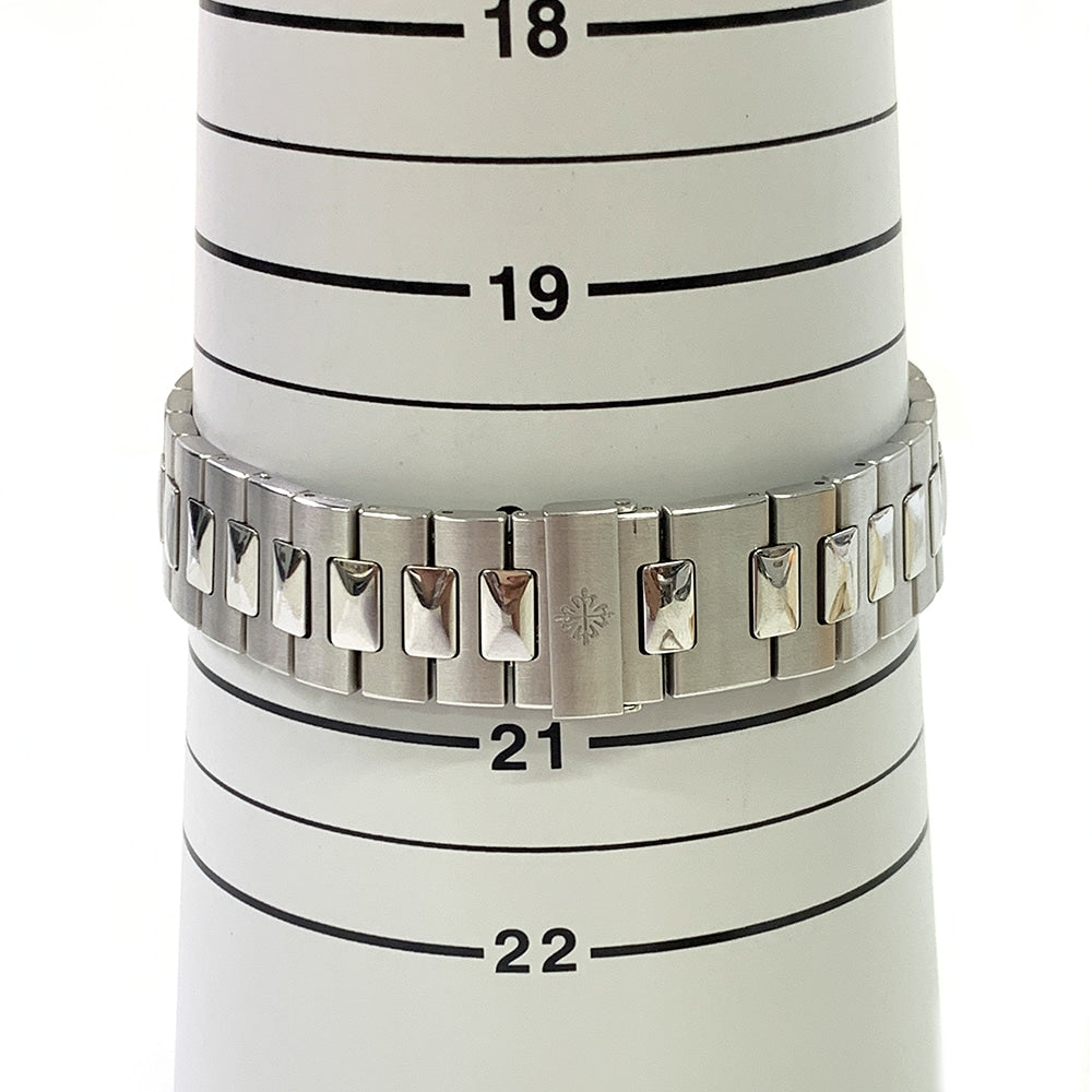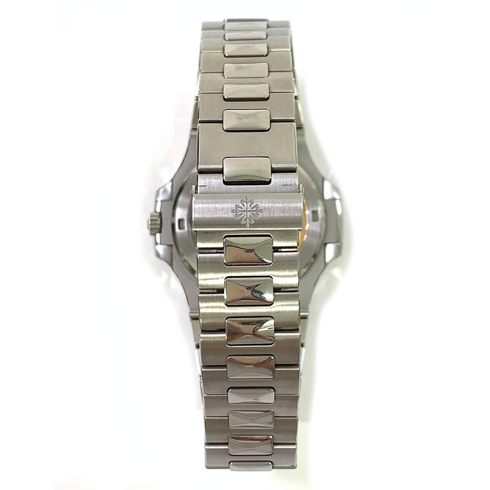 Patek Philippe calibre 324 S C automatic movement, containing 29 Jewels, composed of 213 parts, bitting at 28800 vph, and has a power reserve of approximately 45 hours. Scratch resistant sapphire crystal. Transparent case back. Cushion case shape, case size: 40 mm. Deployment clasp. Water resistant at 120 meters / 400 feet. Functions: hour, minute, second. Nautilus Series. Luxury watch style. Watch label: Swiss Made. FULL LINKS.