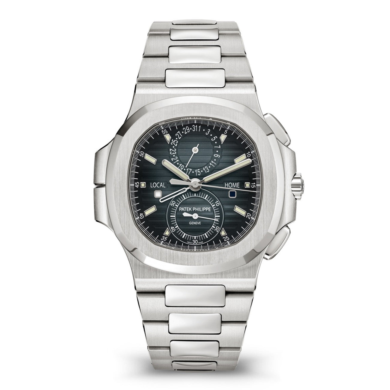 Powered by the self-winding Caliber CH 28-520 C FUS, it combines a flyback chronograph, a dual-time-zone function (with skeletonized home-time hand), and an analog date synchronized with local time. The 40.5mm steel case is water-resistant to 30m, with a sapphire case back and a patented fold-over clasp for comfort. A perfect fusion of elegance and functionality, this Nautilus is a standout in Patek Philippe's collection.