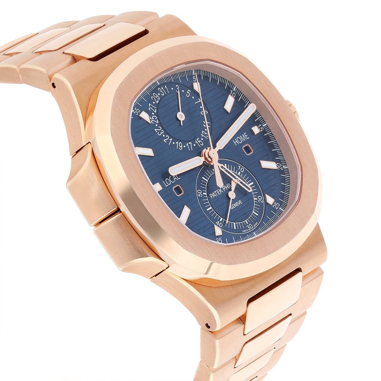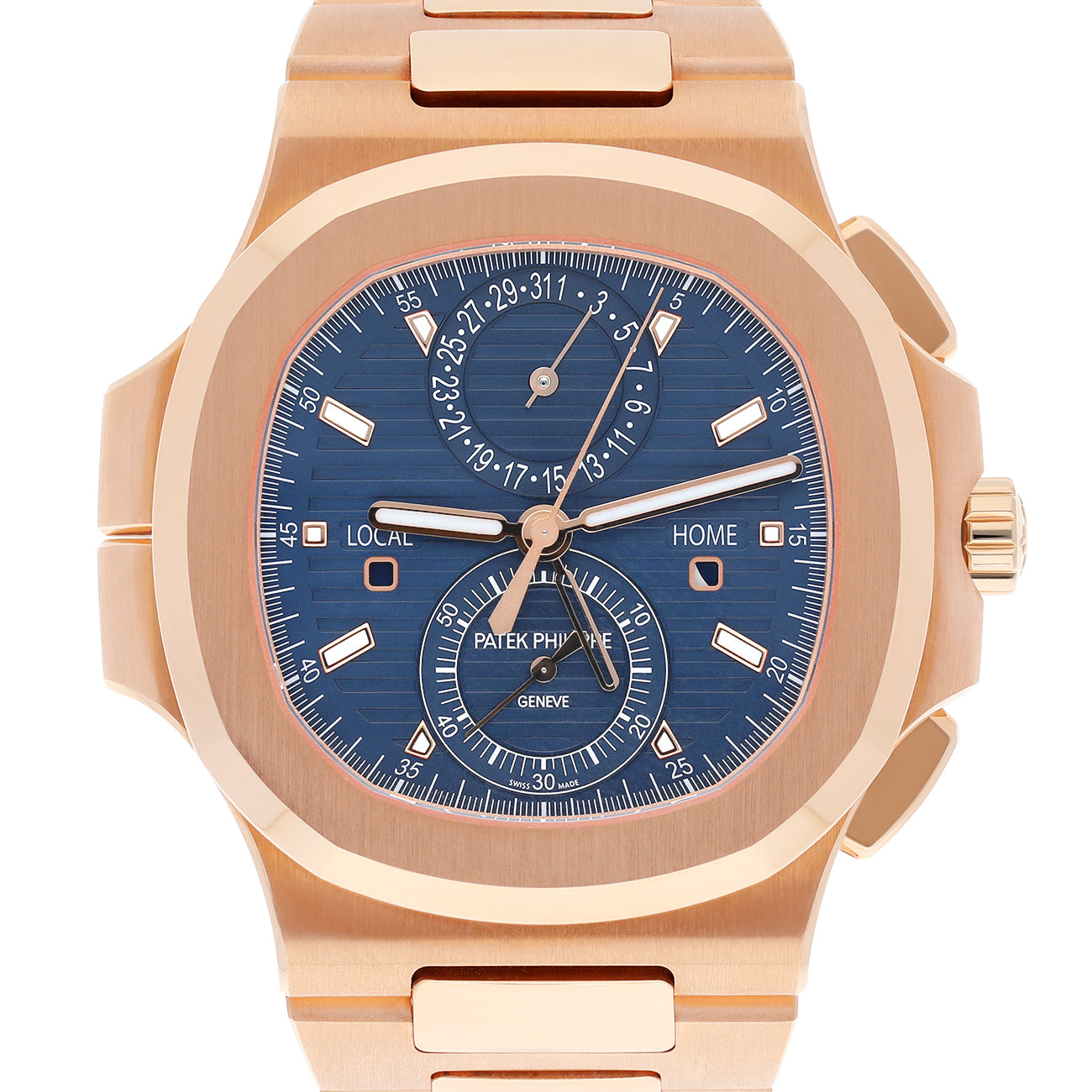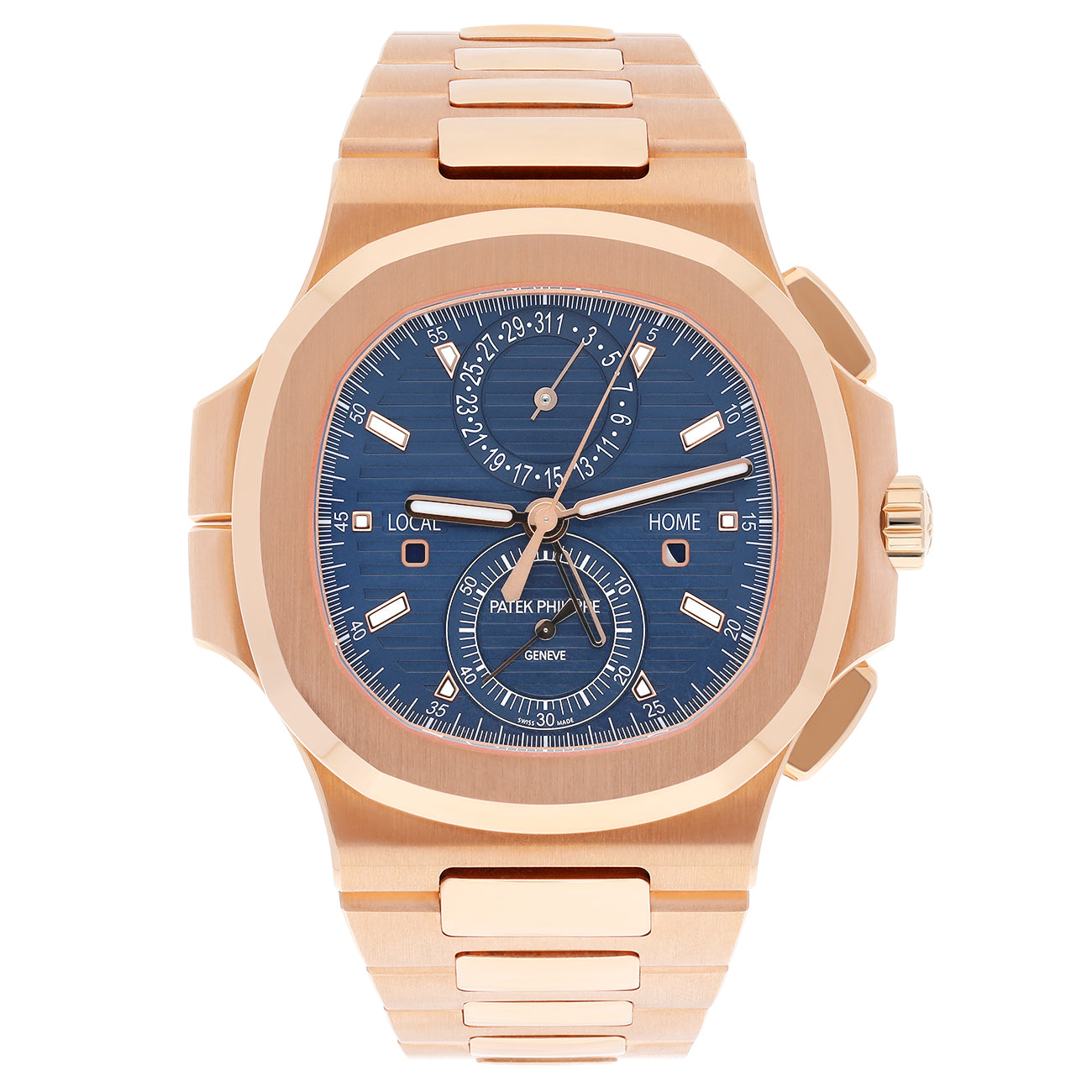 The Patek Philippe Nautilus Travel Time Chronograph Reference 5990/1R in rose gold combines elegance with advanced watchmaking expertise. Featuring a striking sunburst blue dial with an embossed horizontal pattern and luminous rose gold hour markers, this timepiece houses three coveted complications: a self-winding flyback chronograph, a dual-time-zone Travel Time function, and a date display synchronized with local time.
