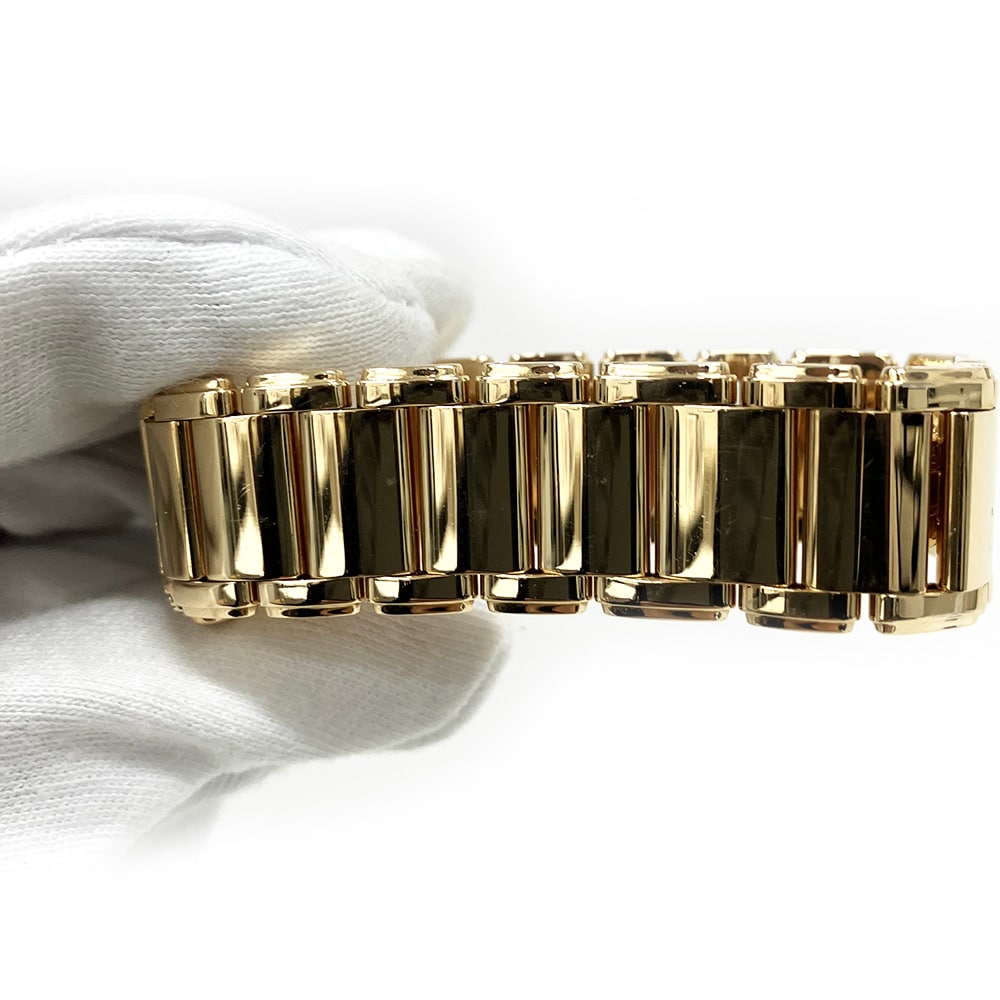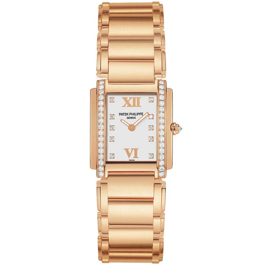 18kt rose gold case with a 18kt rose gold bracelet. Fixed 18kt rose gold bezel set with diamonds. White dial with rose gold-tone hands and diamond hour markers. Roman numerals mark the 6 and 12 o'clock positions. Dial Type: Analog. Luminescent hands. Patek Philippe calibre E15 quartz movement. Scratch resistant sapphire crystal. Pull / push crown. Solid case back.