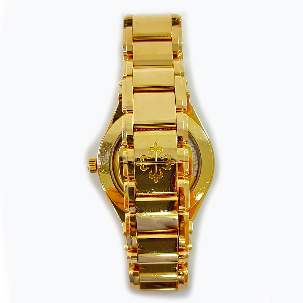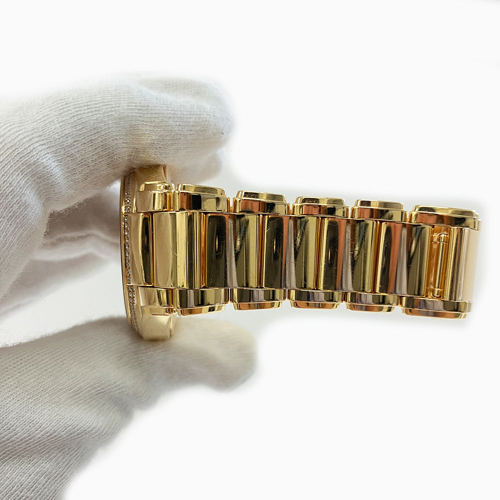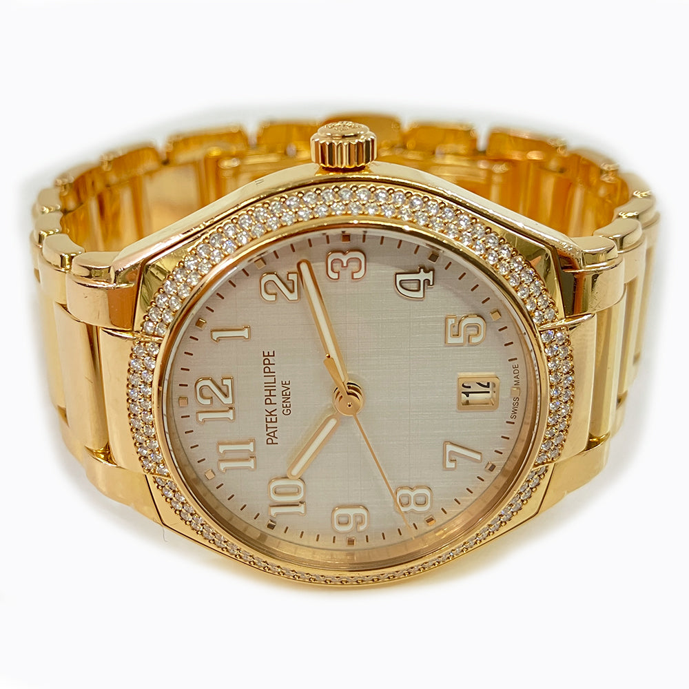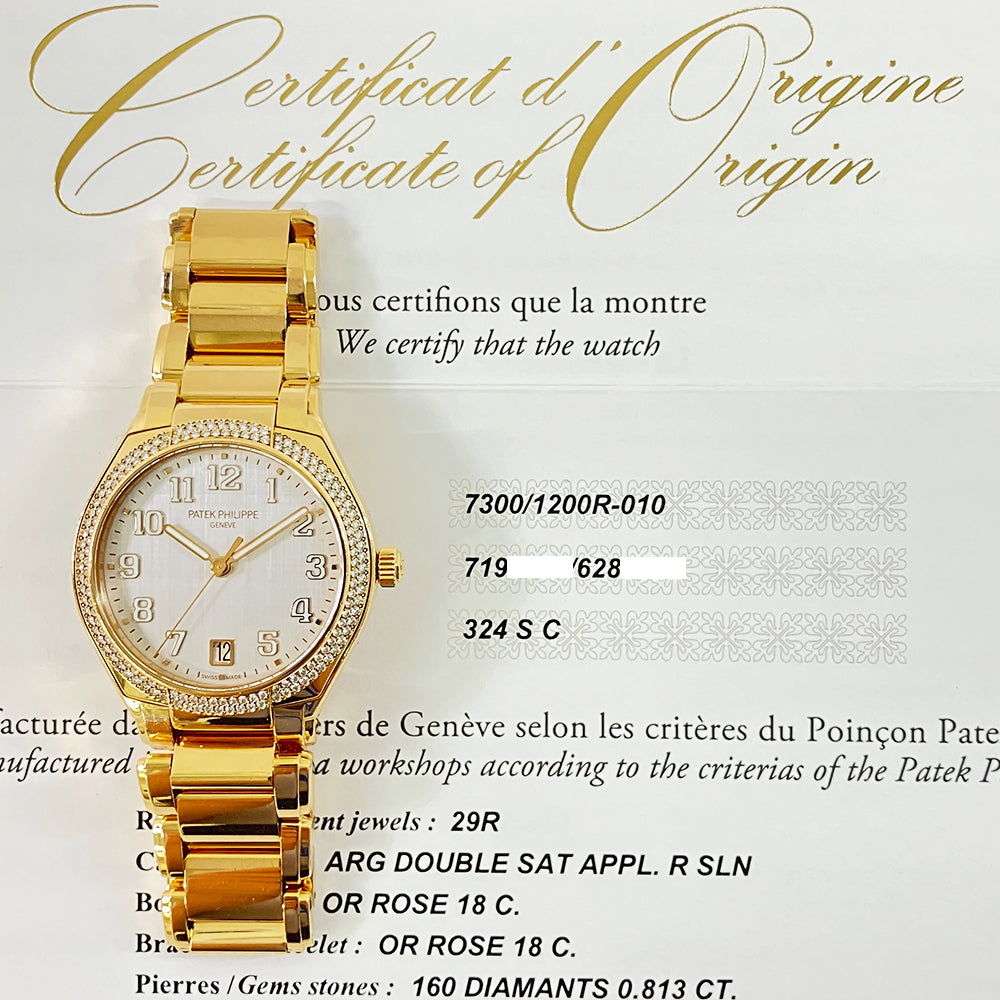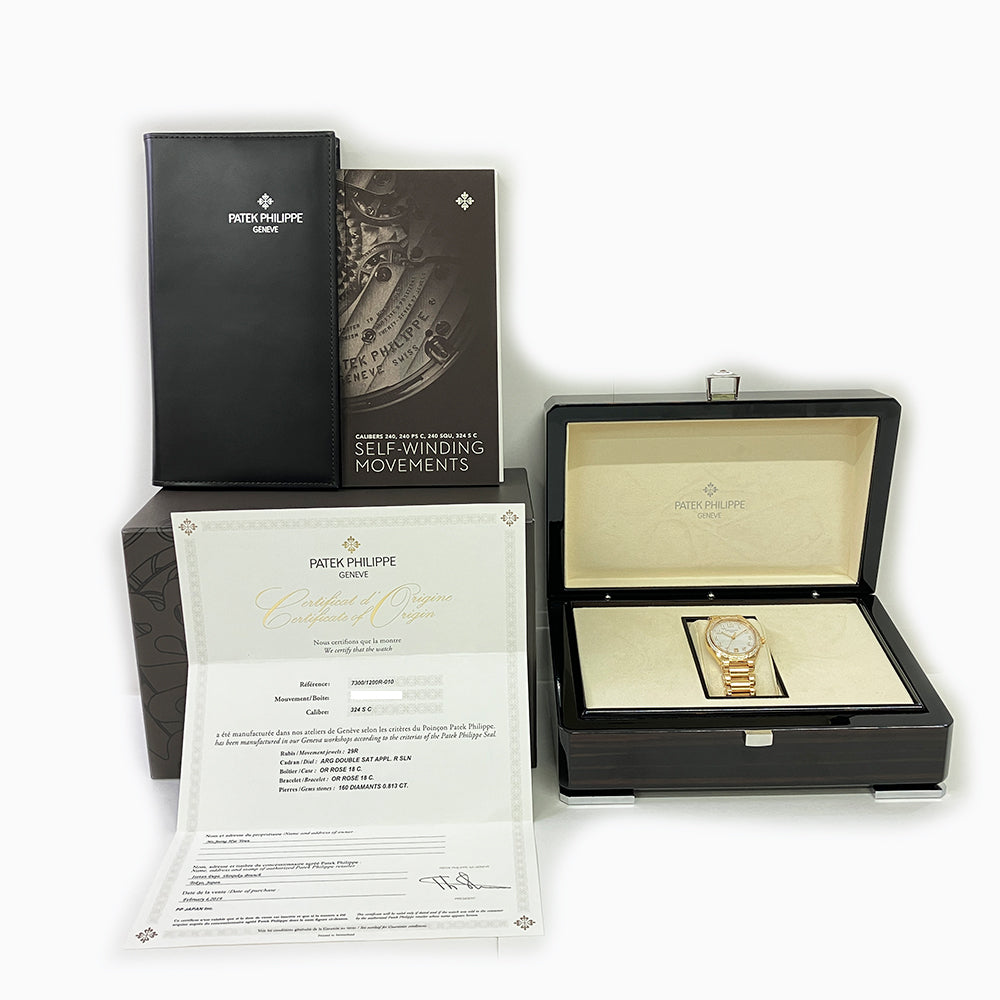 The Patek Philippe Twenty-4 woman's watch, Model # 7300/1200R-010 18k rose gold 36mm case. Silver dial with applied gold Arabic numeral hour markers. Hours, minutes and date. Bezel set with double row 160 diamonds: ~0.77 ct., 0.45ct. Self-winding mechanical movement. Caliber 324 S C. 18k rose gold bracelet with hidden folding deploy buckle with engraved Patek Philippe logo. Water resistant up to 30 meters. Luxury watch style. Watch label: Swiss Made.