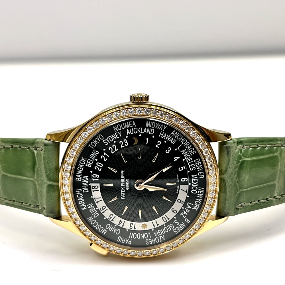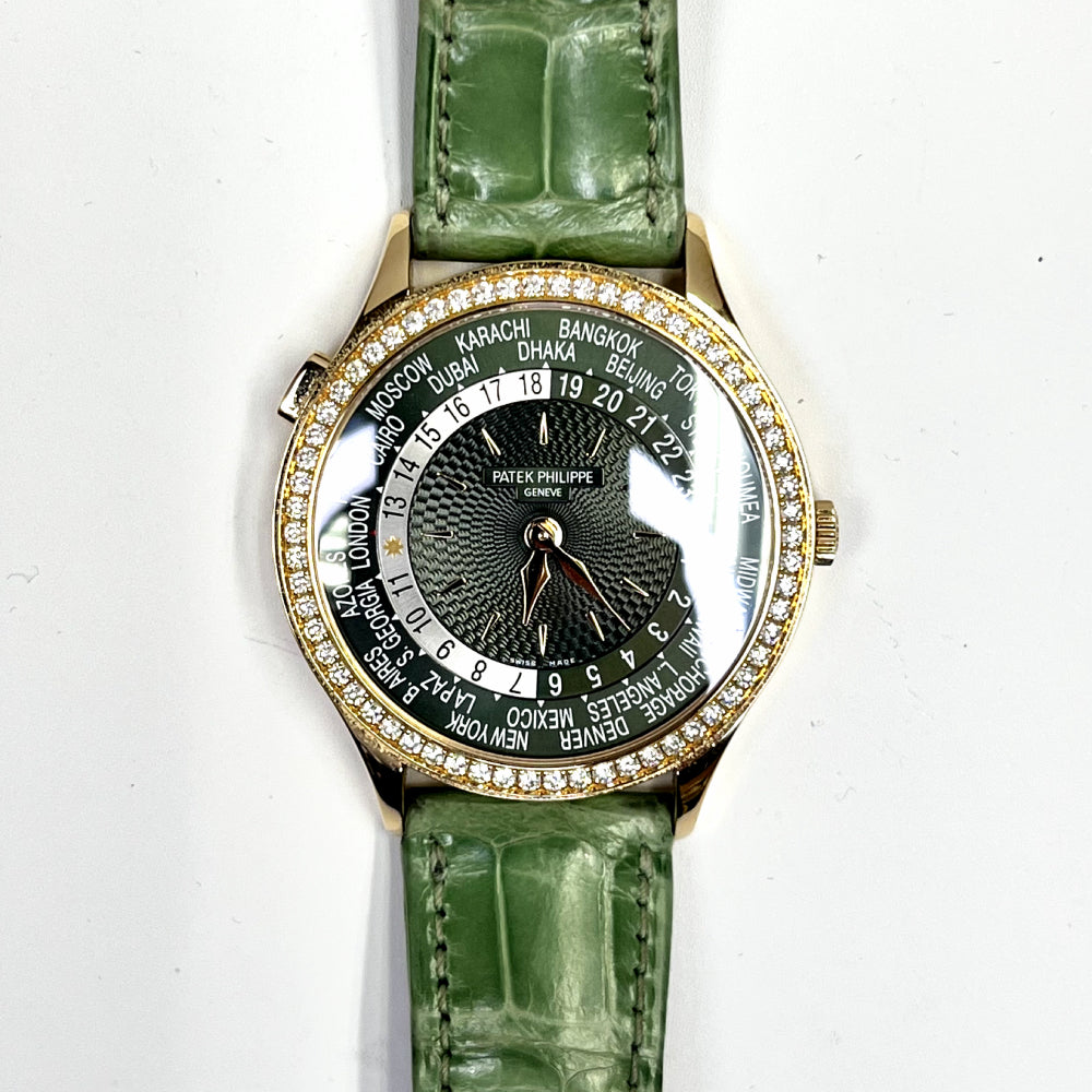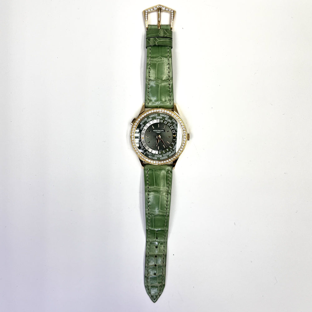 Patek Philippe Complications World Time Green Dial Diamond Rose Gold Leather Strap Women's Luxury Watch Model 7130R-014. 18kt Rose Gold case with Shiny Olive Green Calfskin Leather strap. Tang clasp. Fixed- Diamond Set bezel. Dial description: Gold Toned Hands and Index Hour Markers With World Cities Around the Outer rim and Day/Night Indicator Displayed, on an Olive Green dial. Automatic movement. Powered by Patek Philippe Calibre 240 HU engine.
