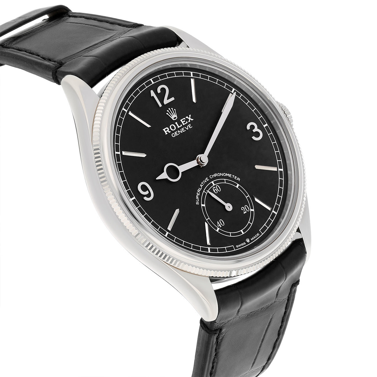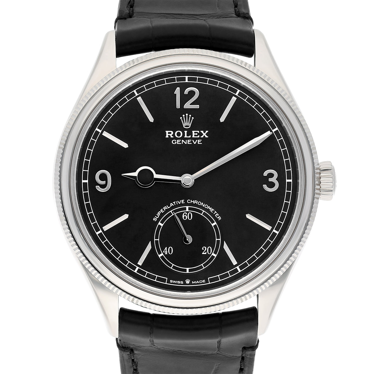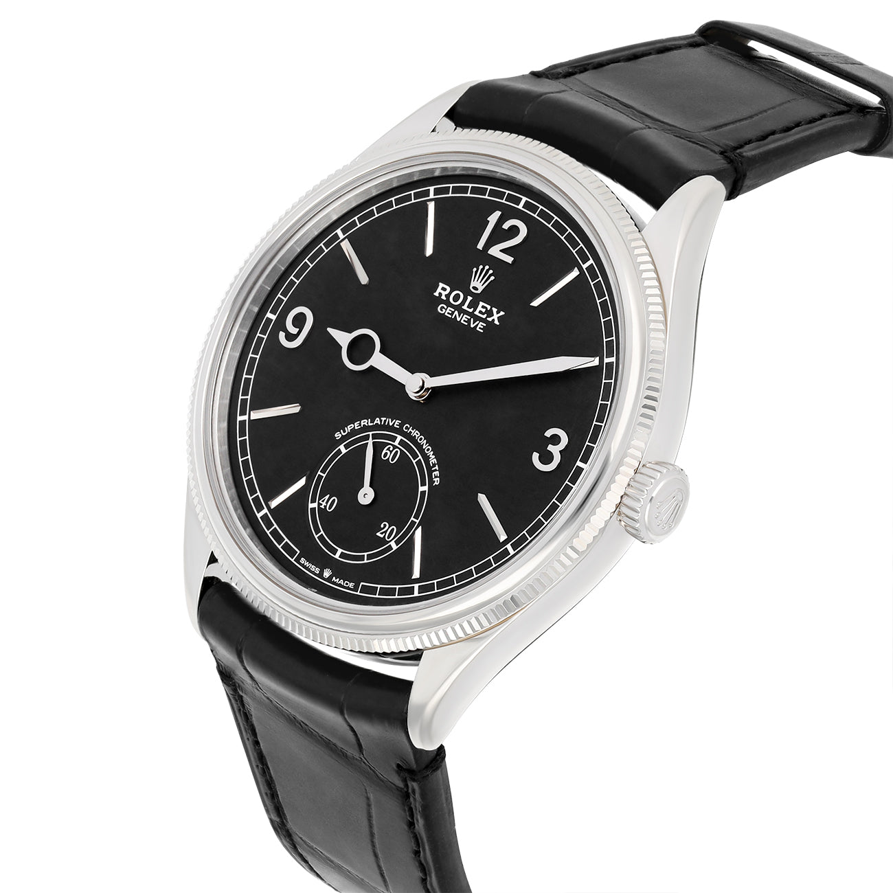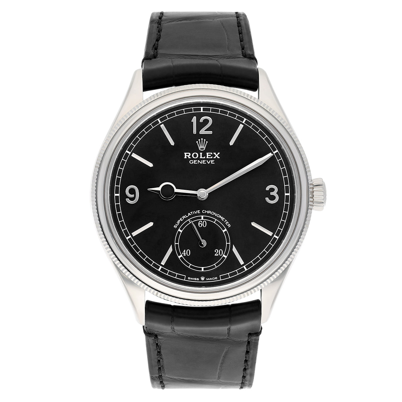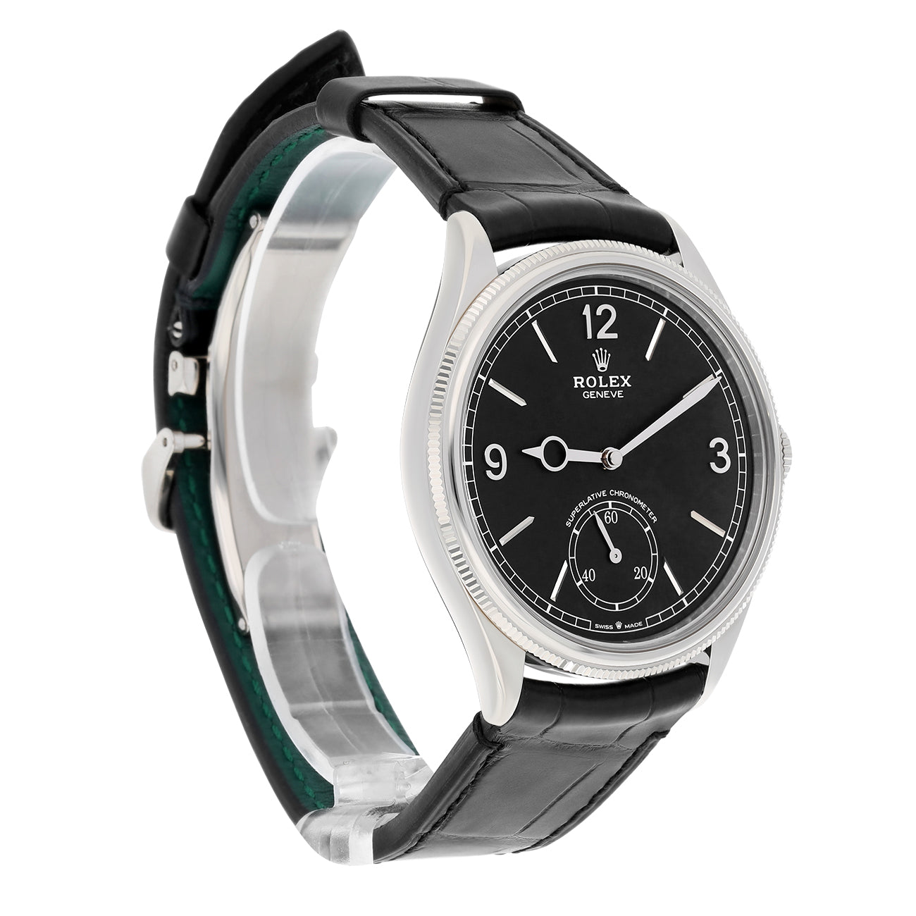 Rolex 1908 - 52509-0002 Alligator Leather Strap Domed And Fluted Bezel Black Index Arabic Dial White Gold Watch