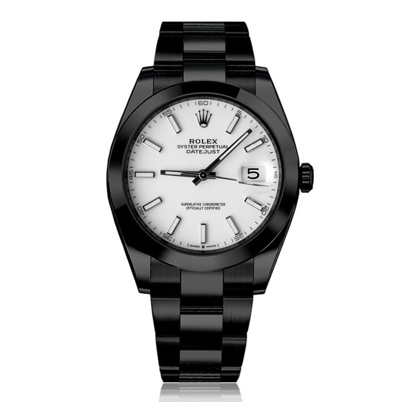 Rolex 41mm Datejust Black PVD/DLC Watch Oyster Band White Dial. Watch has been professionally coated with PVD/DLC coating aftermarket. It has never been worn after customization.