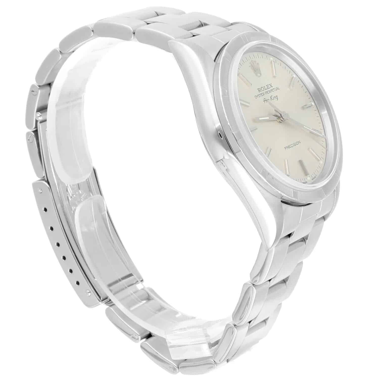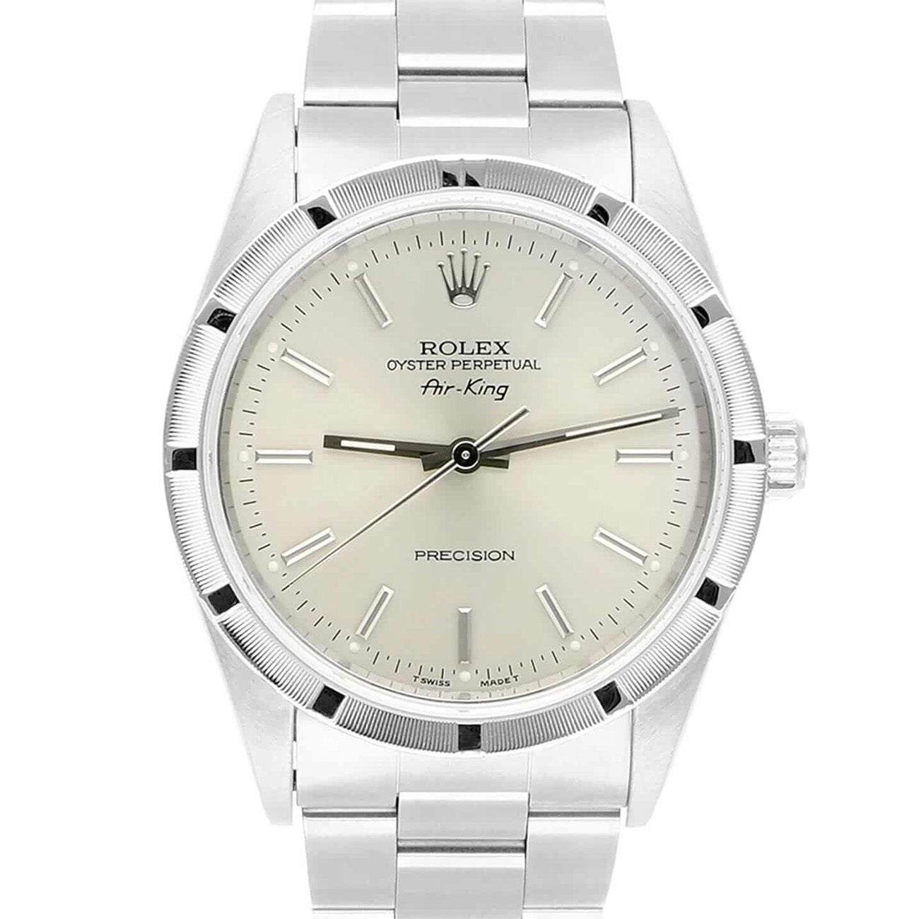 Rolex Air King 34mm Silver Dial Engine Turned Bezel Steel Mens Watch 14010, Circa 1996. This watch has been professionally polished, serviced and is in excellent overall condition. There are absolutely no visible scratches or blemishes. Authenticity of the watch guaranteed!Sale is covered by our in-house 1 year mechanical warranty.