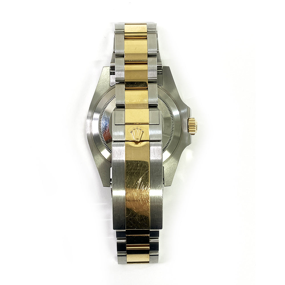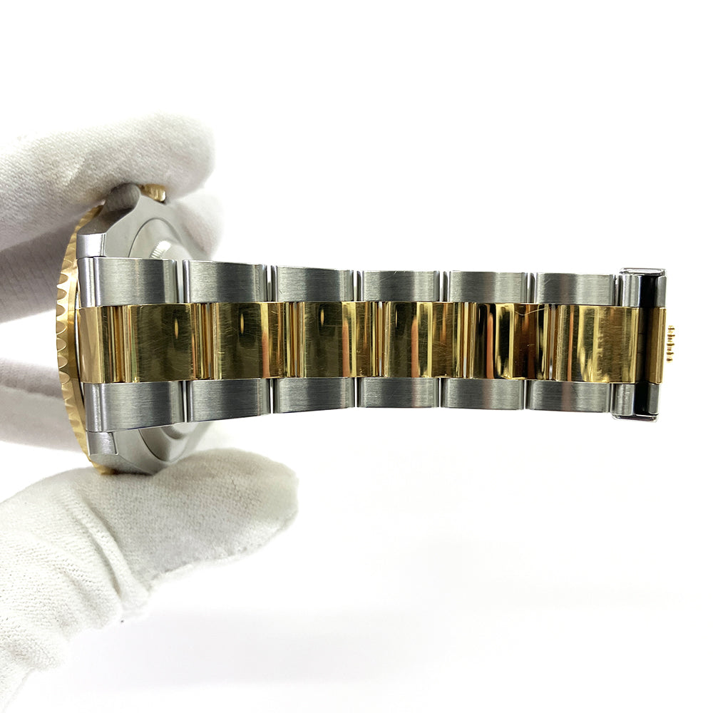 Stainless steel case with a stainless steel Rolex oyster bracelet with 18kt yellow gold center links. Uni-directional rotating 18kt yellow gold bezel with a blue cerachrom (count-up elapsed time) top ring. Blue dial with luminous yellow gold hands and dot hour markers. Minute markers around the outer rim. Dial Type: Analog. Date display at the 3 o'clock position.