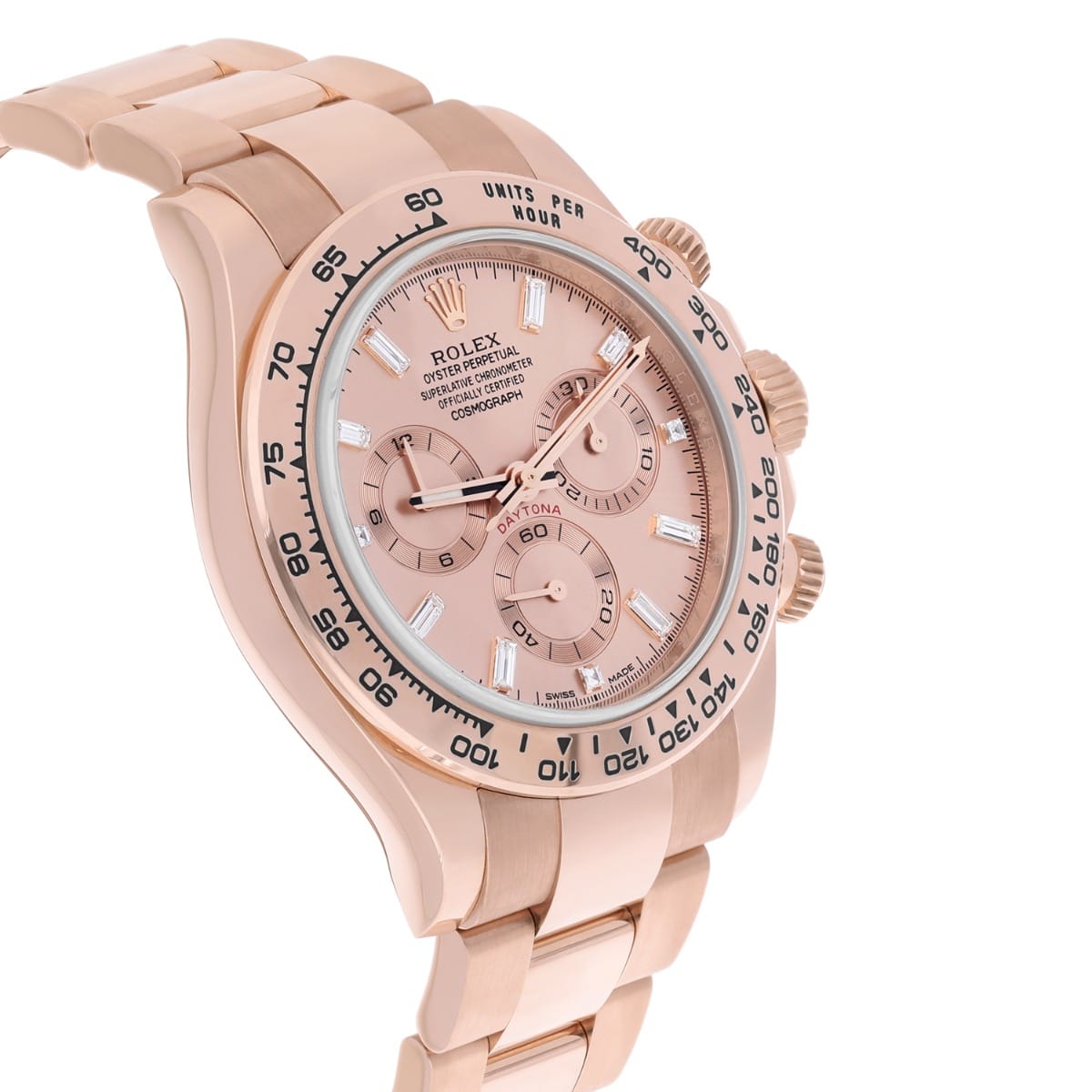 One of the most beautiful Daytonas in production. This 18ct Everose gold Cosmograph with stunning Baguette diamond dial is in superb condition. Fitted to the solid Everose gold Oyster Fliplock bracelet, waterproof to 100m.