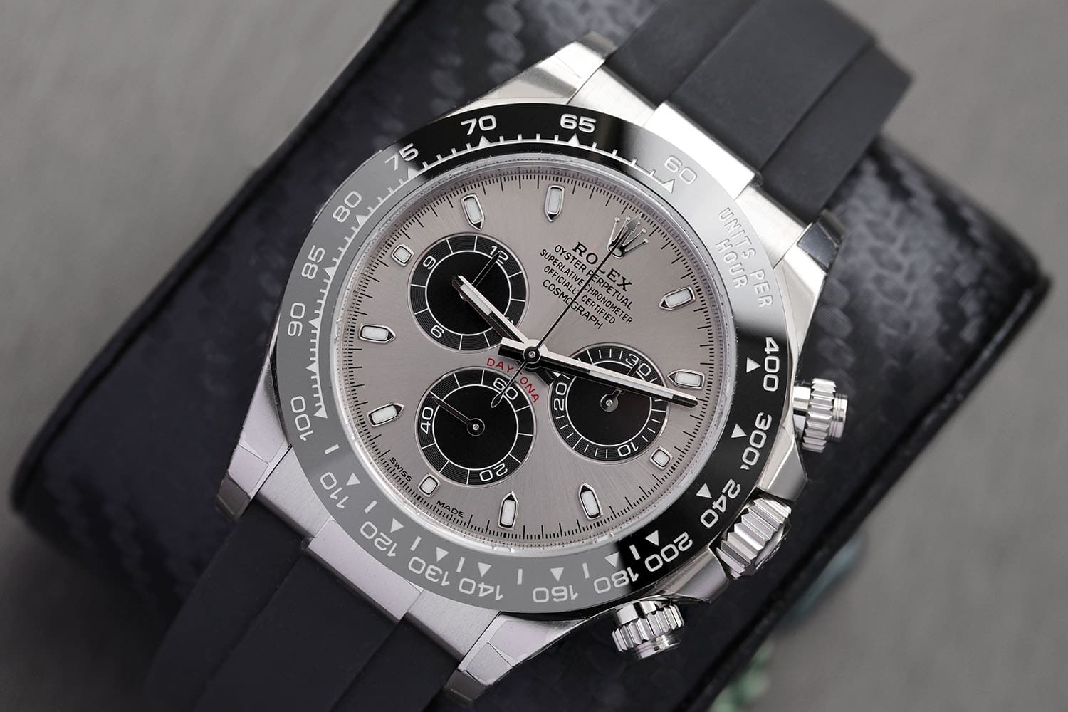 Rolex Cosmograph Daytona 116519LN White Gold With Black Oysterflex Watch Silver Black Subs Dial