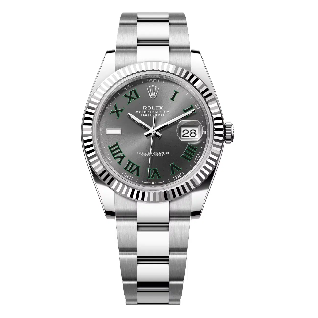 41mm white Rolesor case comprised of a 904L steel monobloc middle case, screw-down steel back, screw-down crown with twinlock double waterproofness system, 18K white gold fluted bezel, scratch-resistant double anti-reflective sapphire crystal with cyclops lens over the date, wimbledon dial, green Roman numerals.