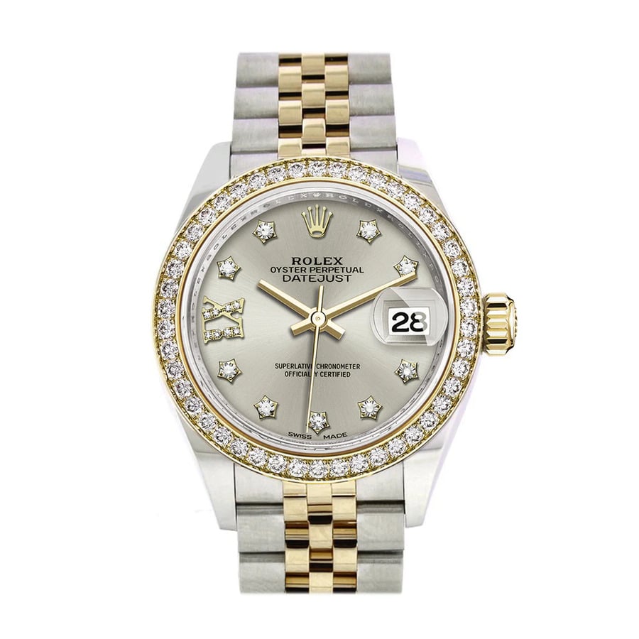 18K Yellow Gold and Stainless Steel, 28mm Case, Silver Dial with 9 Diamonds and Roman Diamond Number at the 9 o'clock, Date Calendar at 3 o'clock Position, Sapphire Crystal, 18K Yellow Gold Pave-Set Bezel with 48 Diamonds, and Jubilee Bracelet with Folding clasp. Luxury watch style. Watch label: Swiss made.