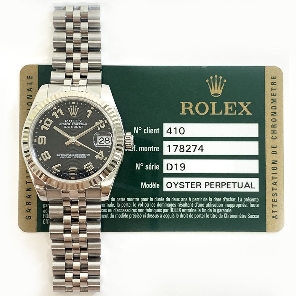 The Rolex Datejust 31, reference number 178274, White gold and steel 31mm case, complemented by a white gold bezel. Concentric Black dial silver-tone hands and Arabic numerals hour markers. Powered by an automatic caliber 2235 movement with a 48-hour power reserve and 31 jewels. Protected by scratch resistant sapphire crystal. Water resistant up to 10 ATM. Luxury watch style. Watch label: Swiss Made.