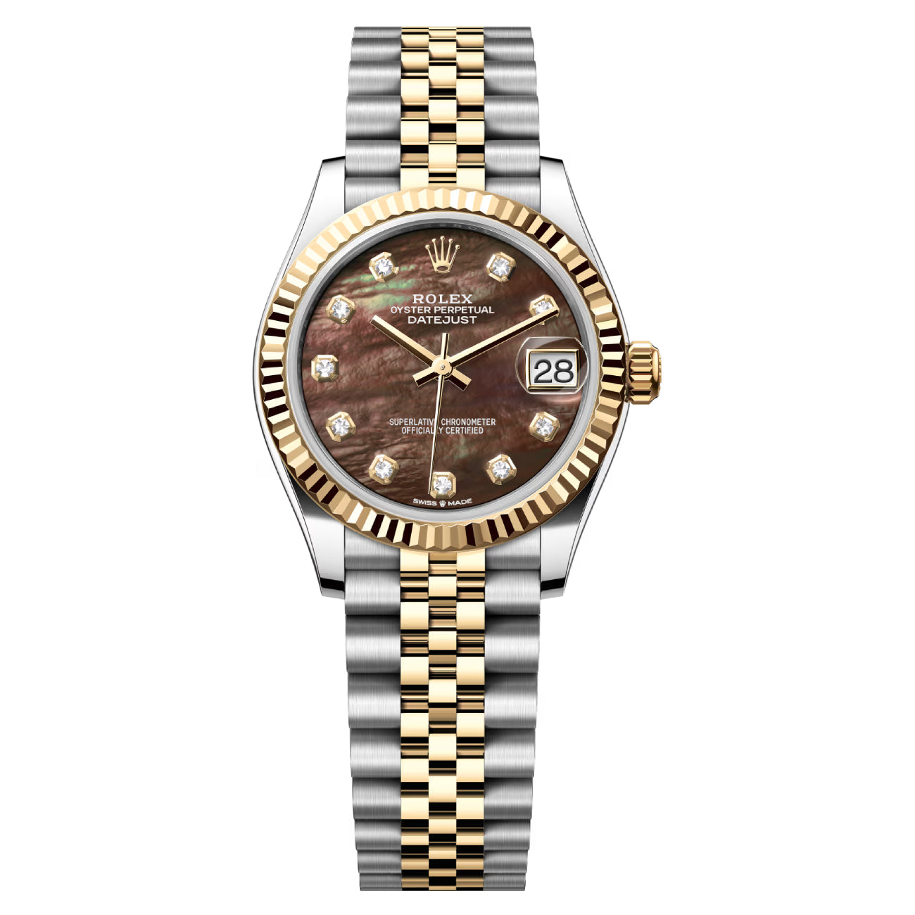 31mm yellow Rolesor case comprised of Oystersteel and 18K yellow gold, screw-down back, screw-down crown with twinlock double waterproofness system, 18K yellow gold fluted bezel, scratch-resistant sapphire crystal with cyclops lens over the date, dark mother-of-pearl dial, diamond hour markers.