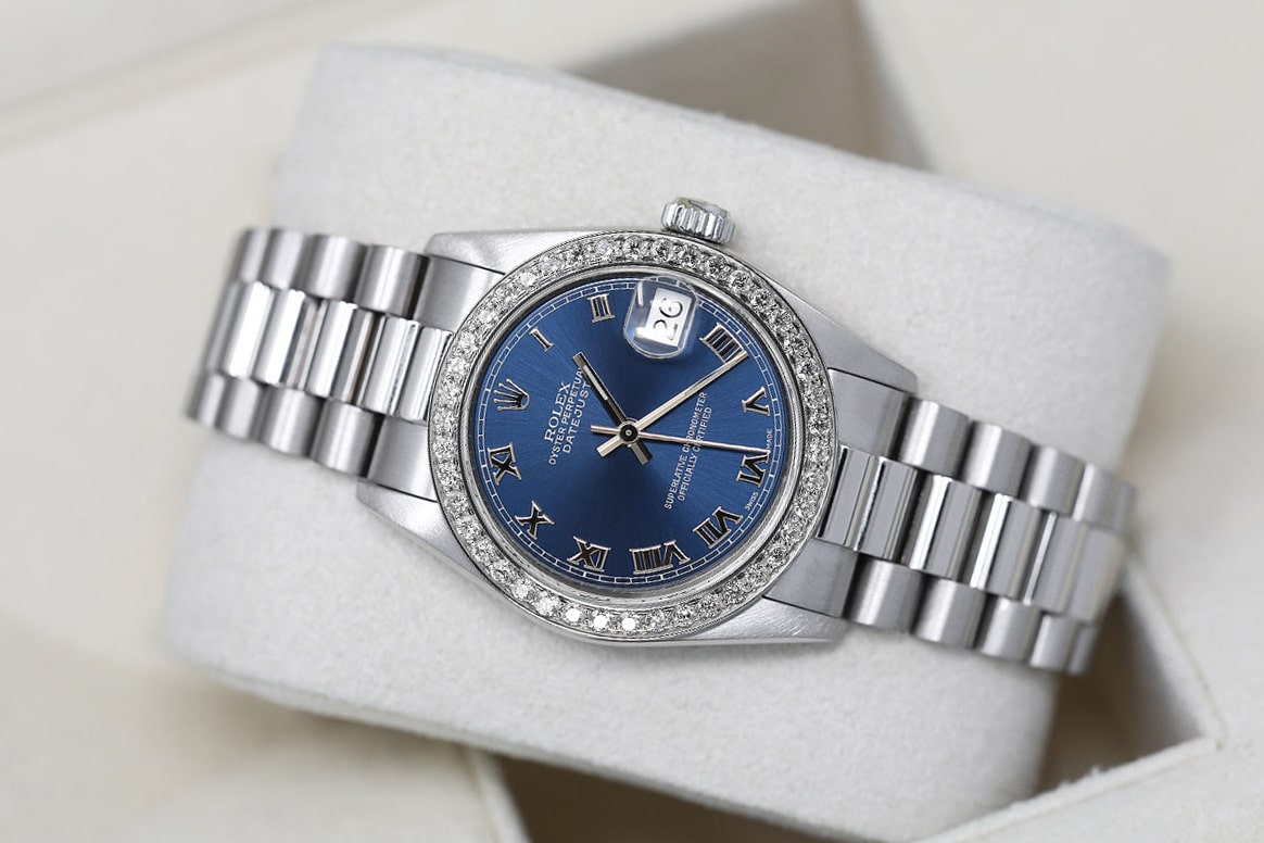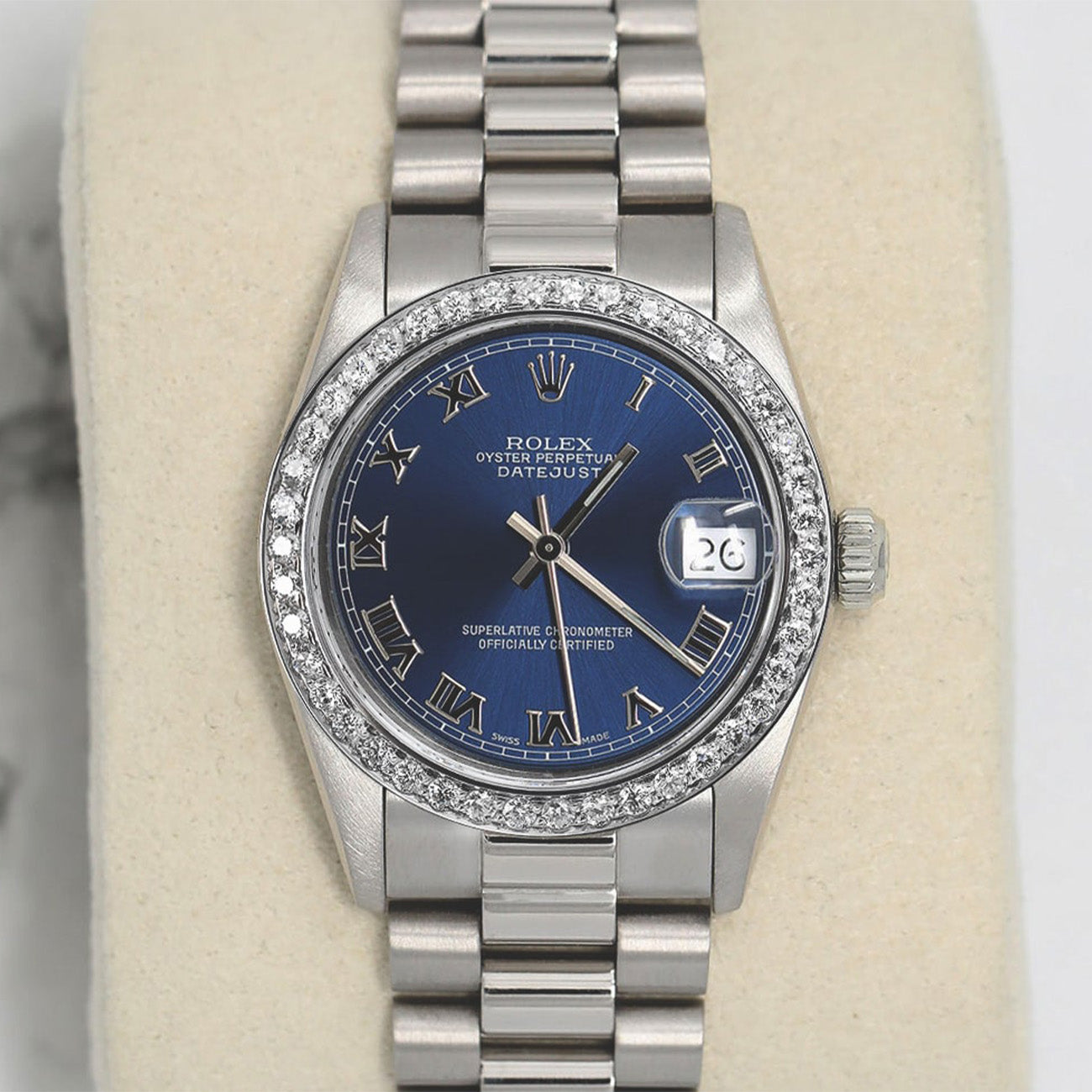 Rolex Datejust 31 White Gold Blue Roman Dial Ladies Watch Presidential Band with Diamond Bezel 68279