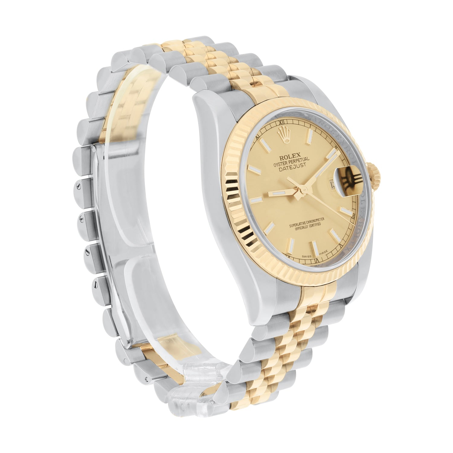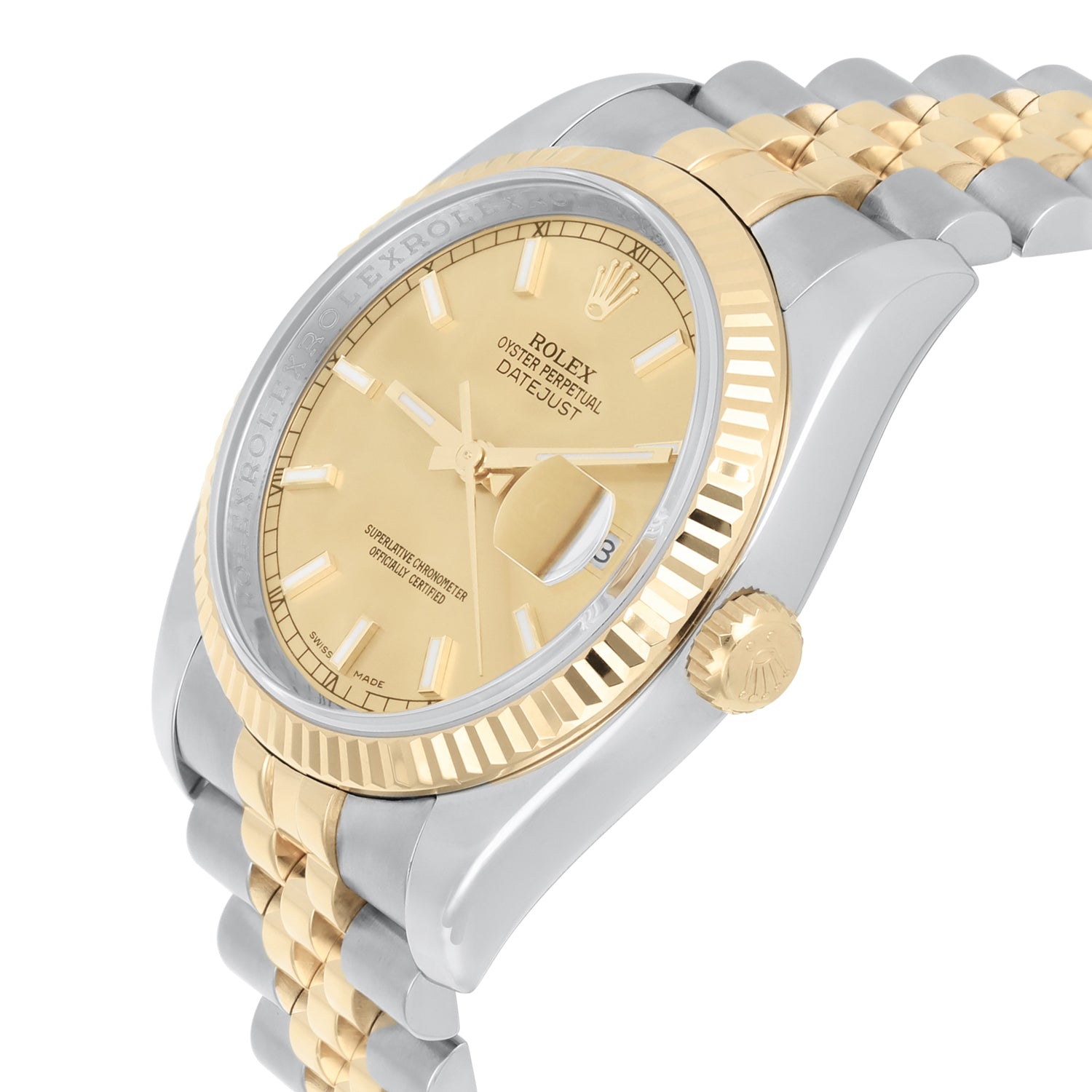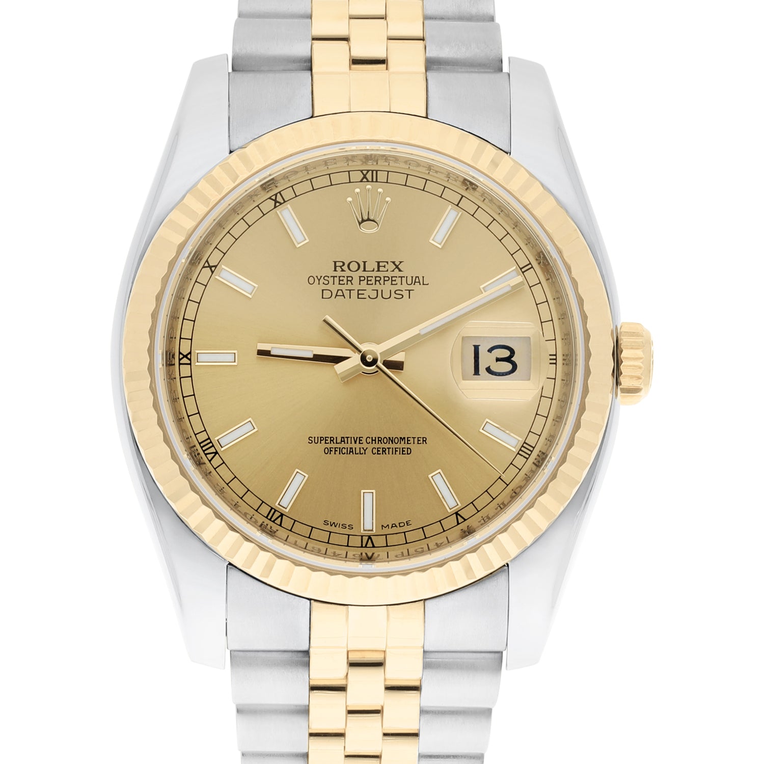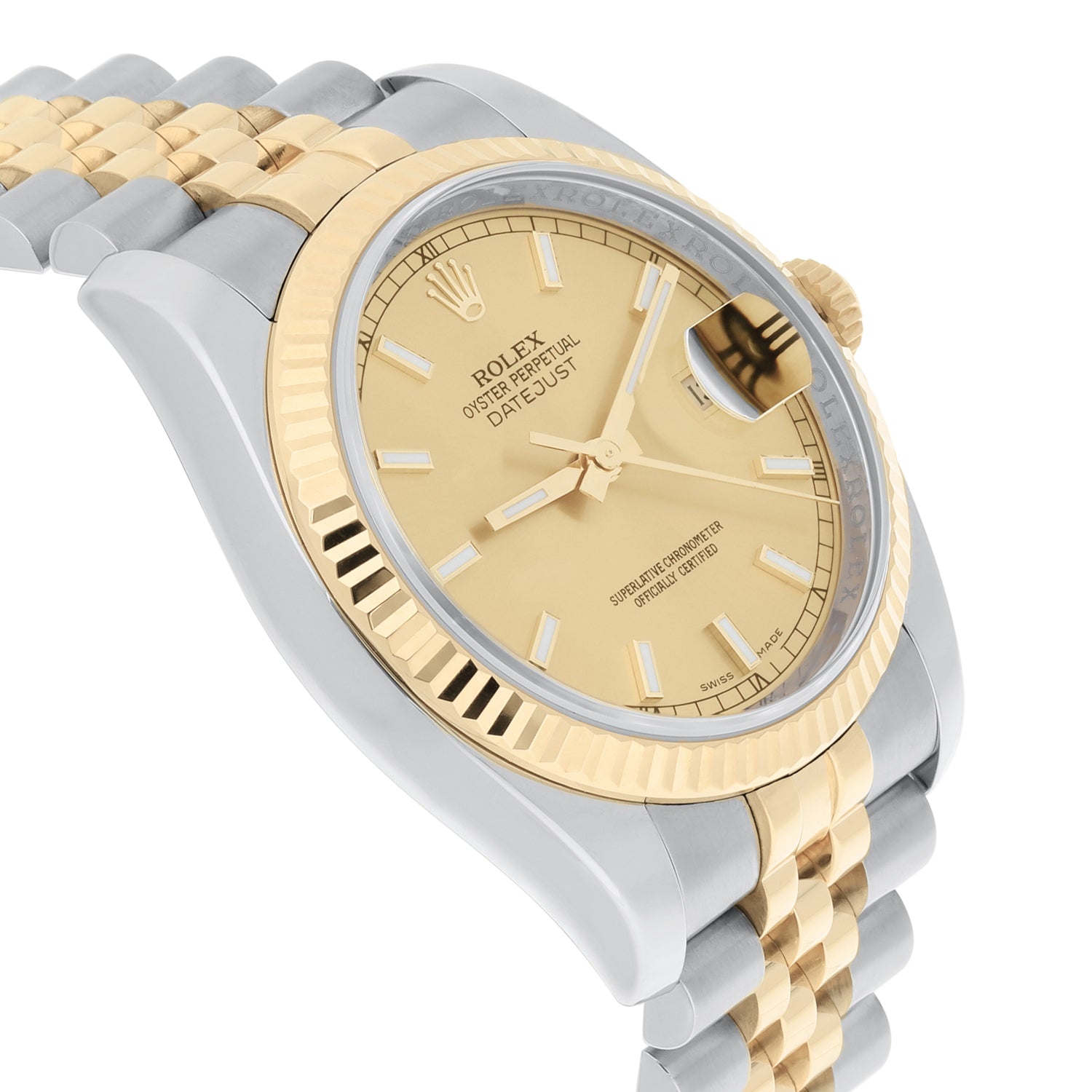 This 36mm Rolex Datejust is crafted from stainless steel and 18k yellow gold, featuring a classic Jubilee bracelet and a solid yellow gold bezel. The champagne dial displays gold-tone hands and a mix of index and Roman numeral hour markers, with a date window at 3 o'clock.