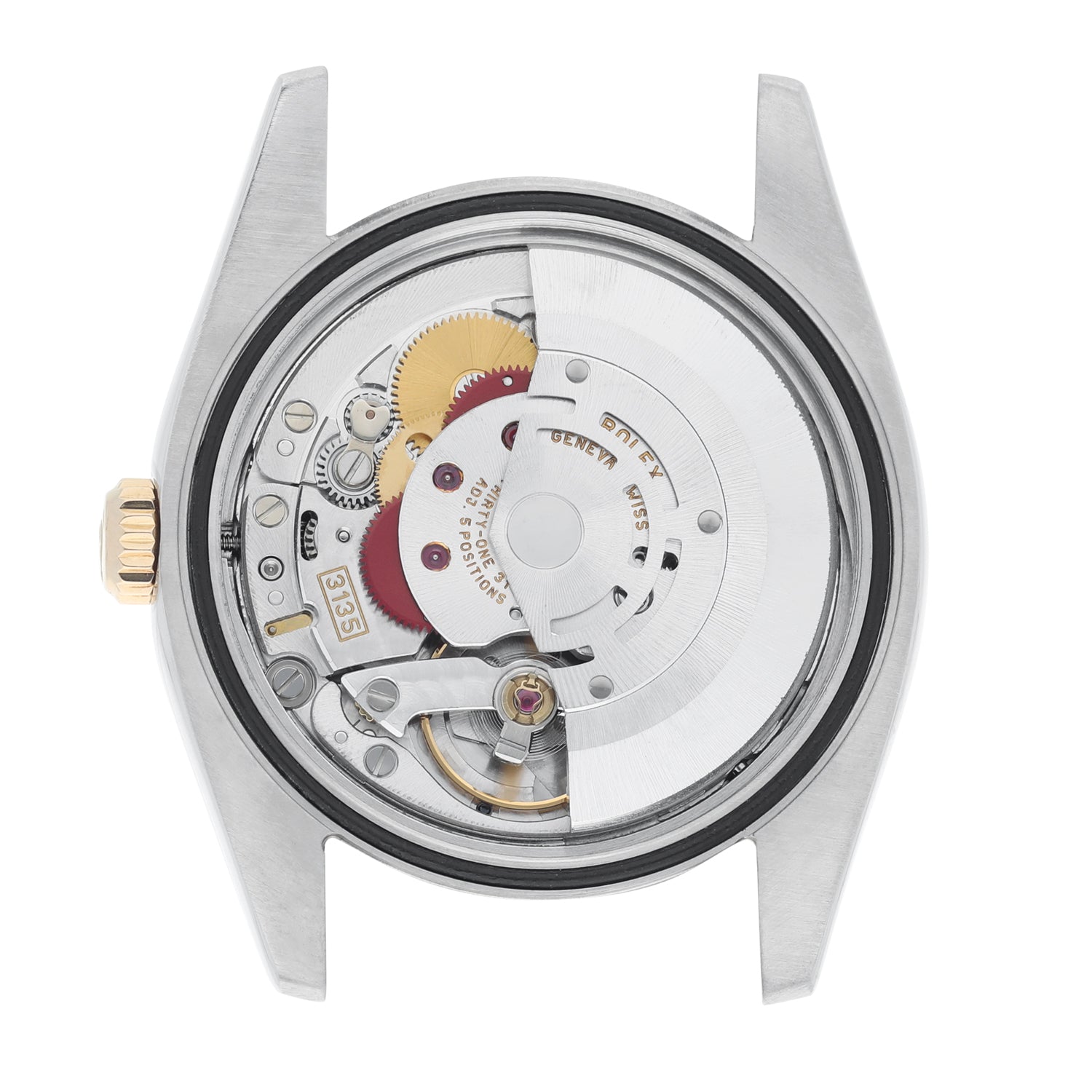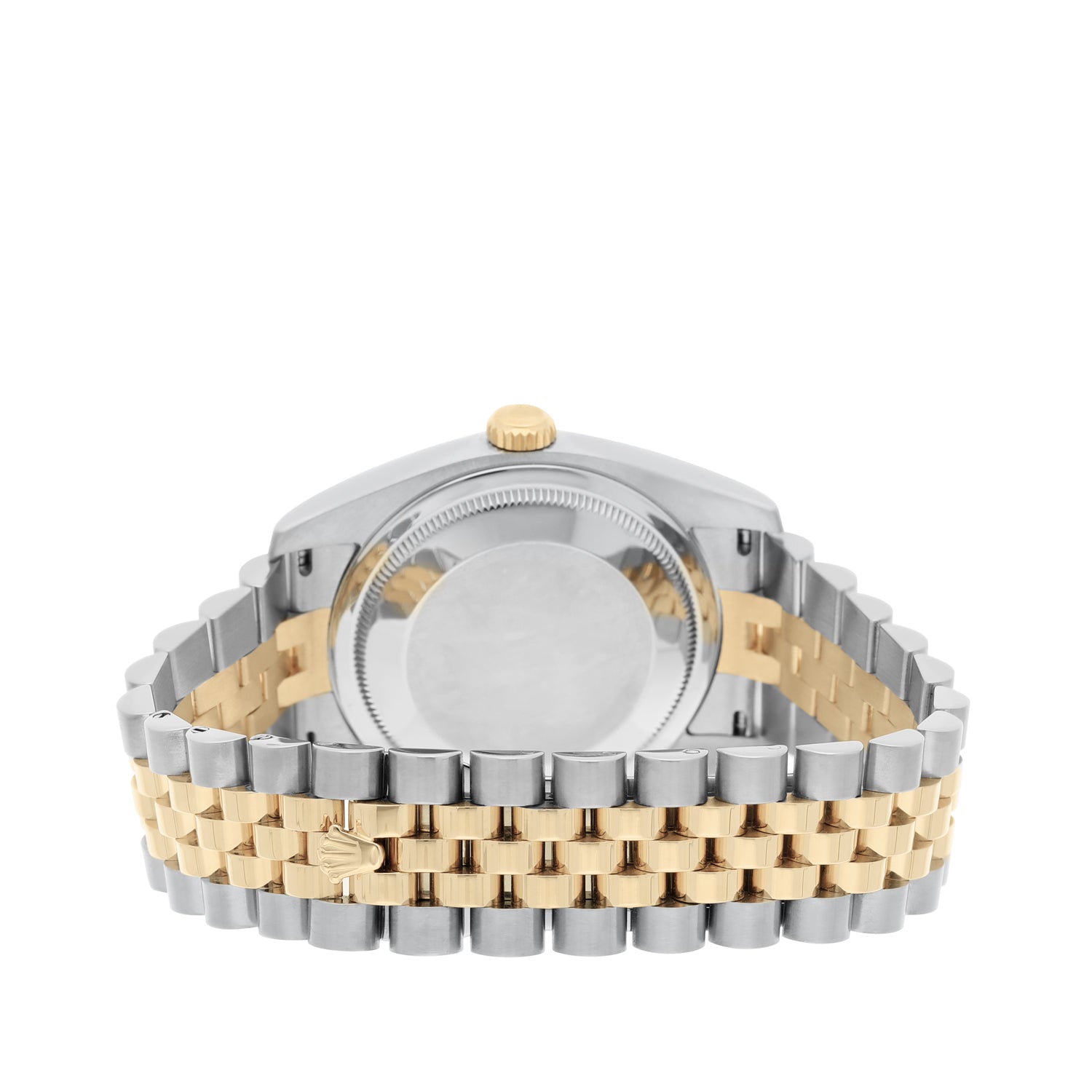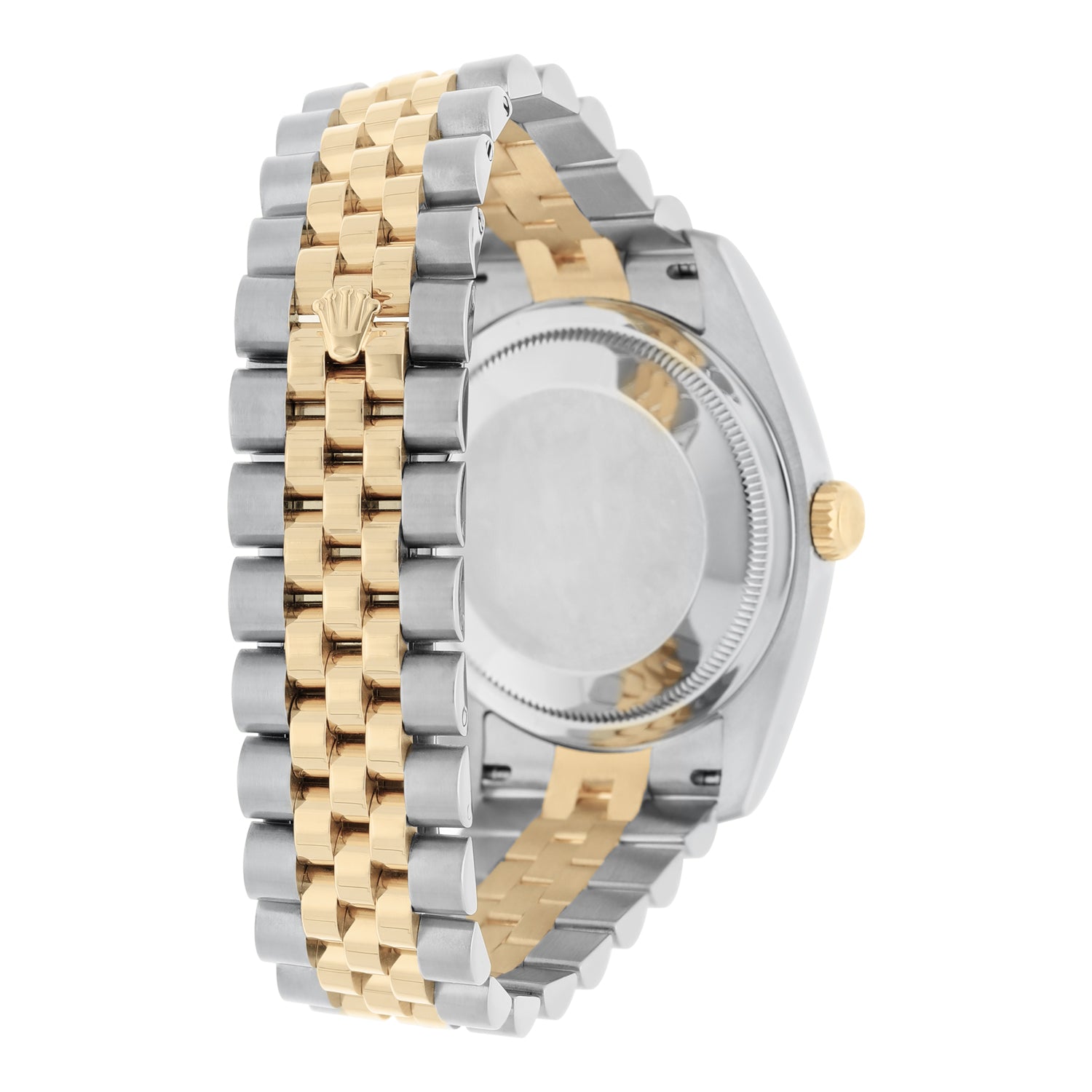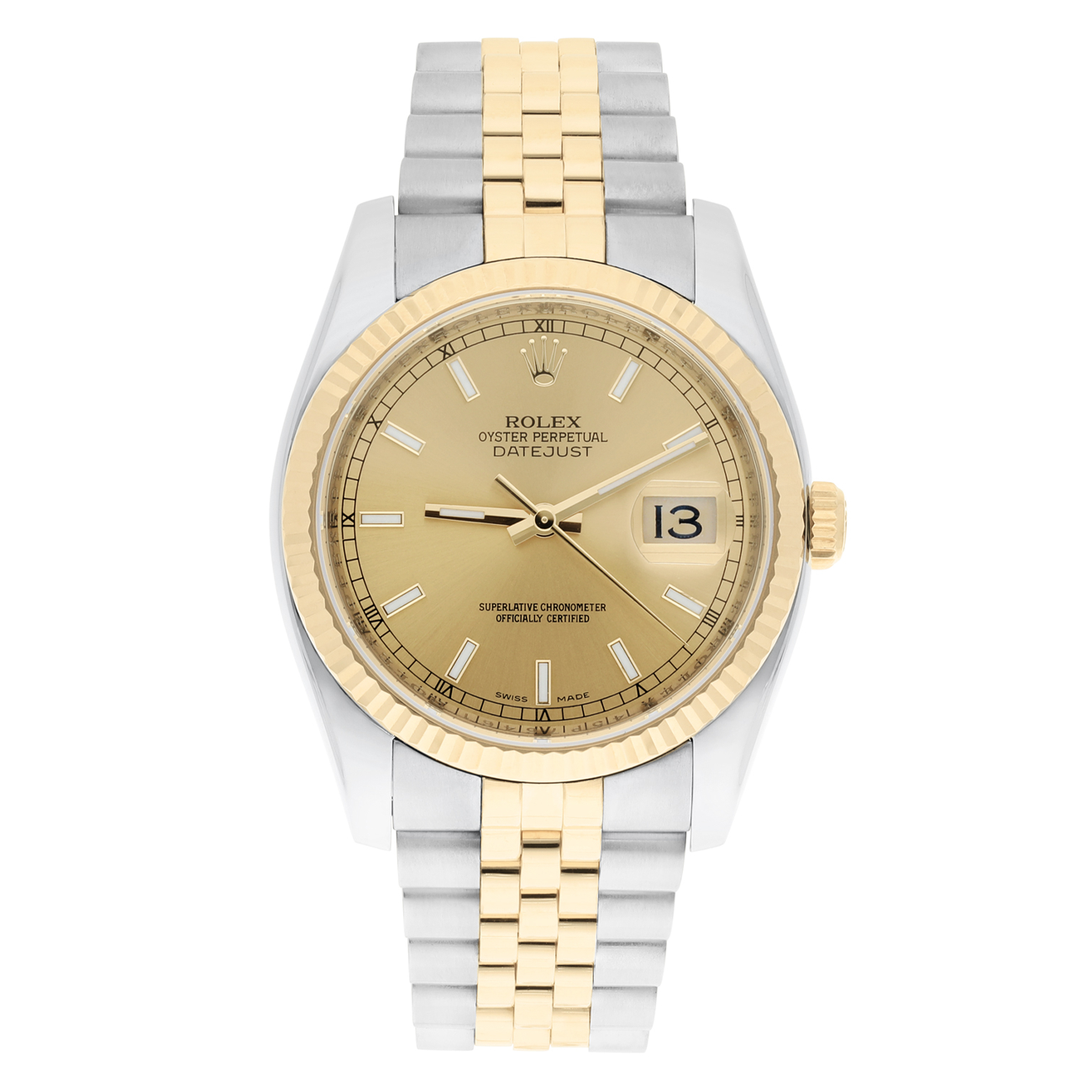 This 36mm Rolex Datejust is crafted from stainless steel and 18k yellow gold, featuring a classic Jubilee bracelet and a solid yellow gold bezel. The champagne dial displays gold-tone hands and a mix of index and Roman numeral hour markers, with a date window at 3 o'clock.