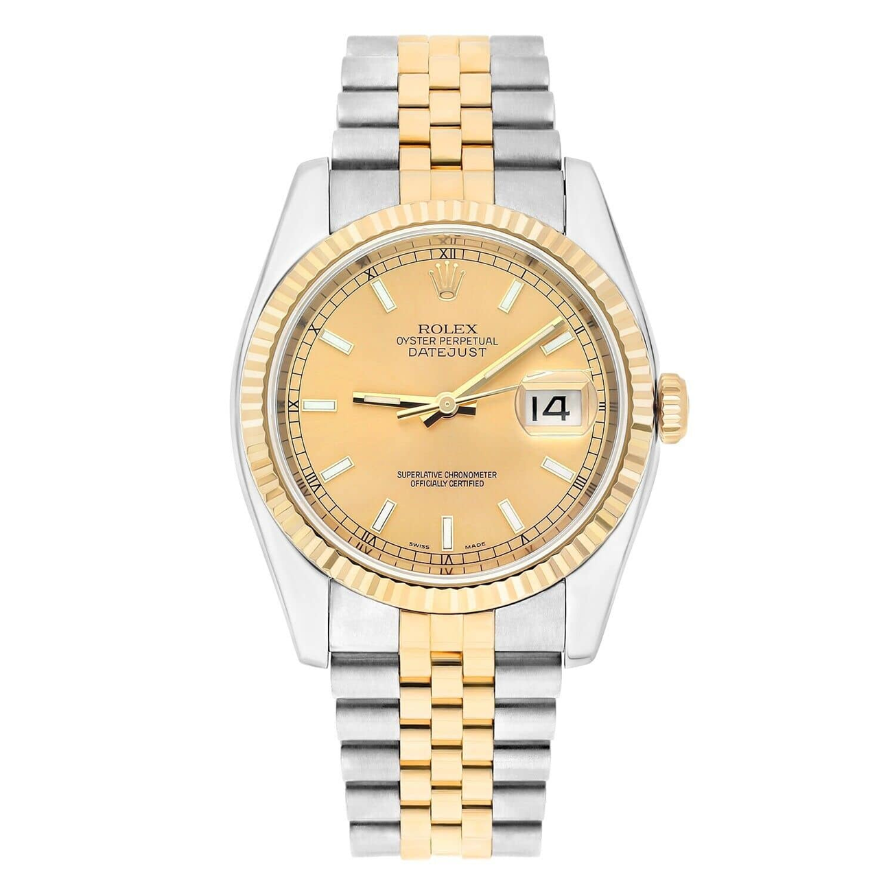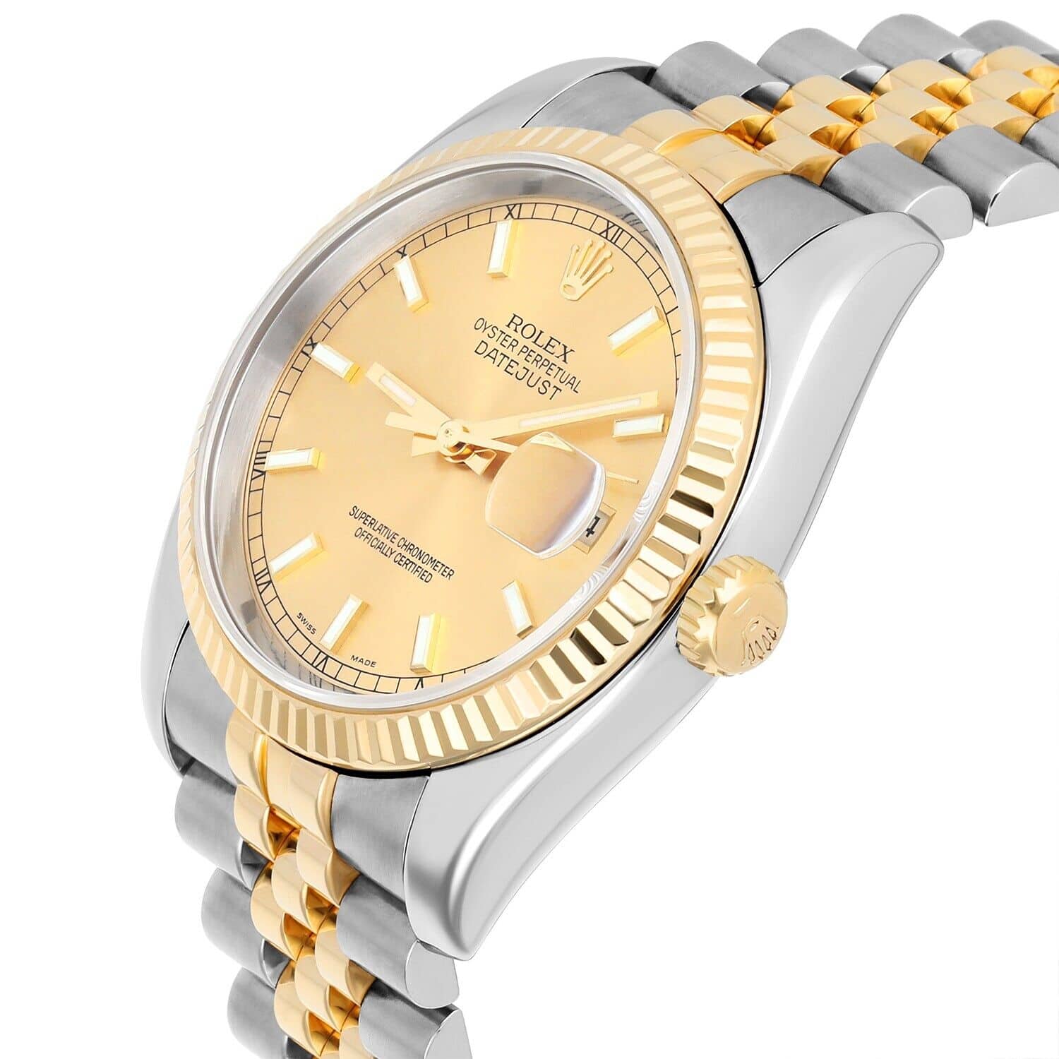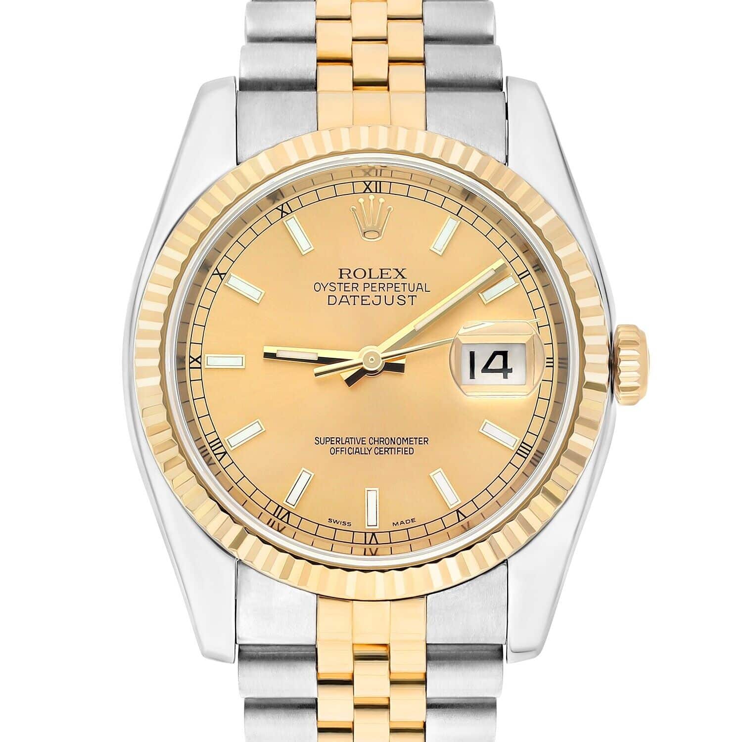 This Rolex Datejust features a 36mm stainless steel case paired with a two-tone Jubilee bracelet in 18k yellow gold and steel. It has a fixed yellow gold bezel and a champagne dial with index and Roman numeral markers. The hands and markers are luminescent for visibility in low light. A date window is set at 3 o'clock.
