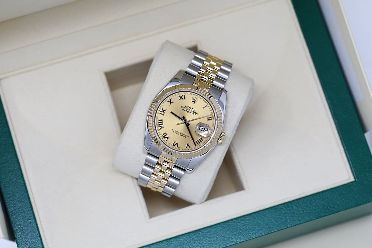 Rolex Datejust 36mm 116233 Two Tone Watch Champagne Roman Numeral Dial Jubilee Band Hidden Clasp