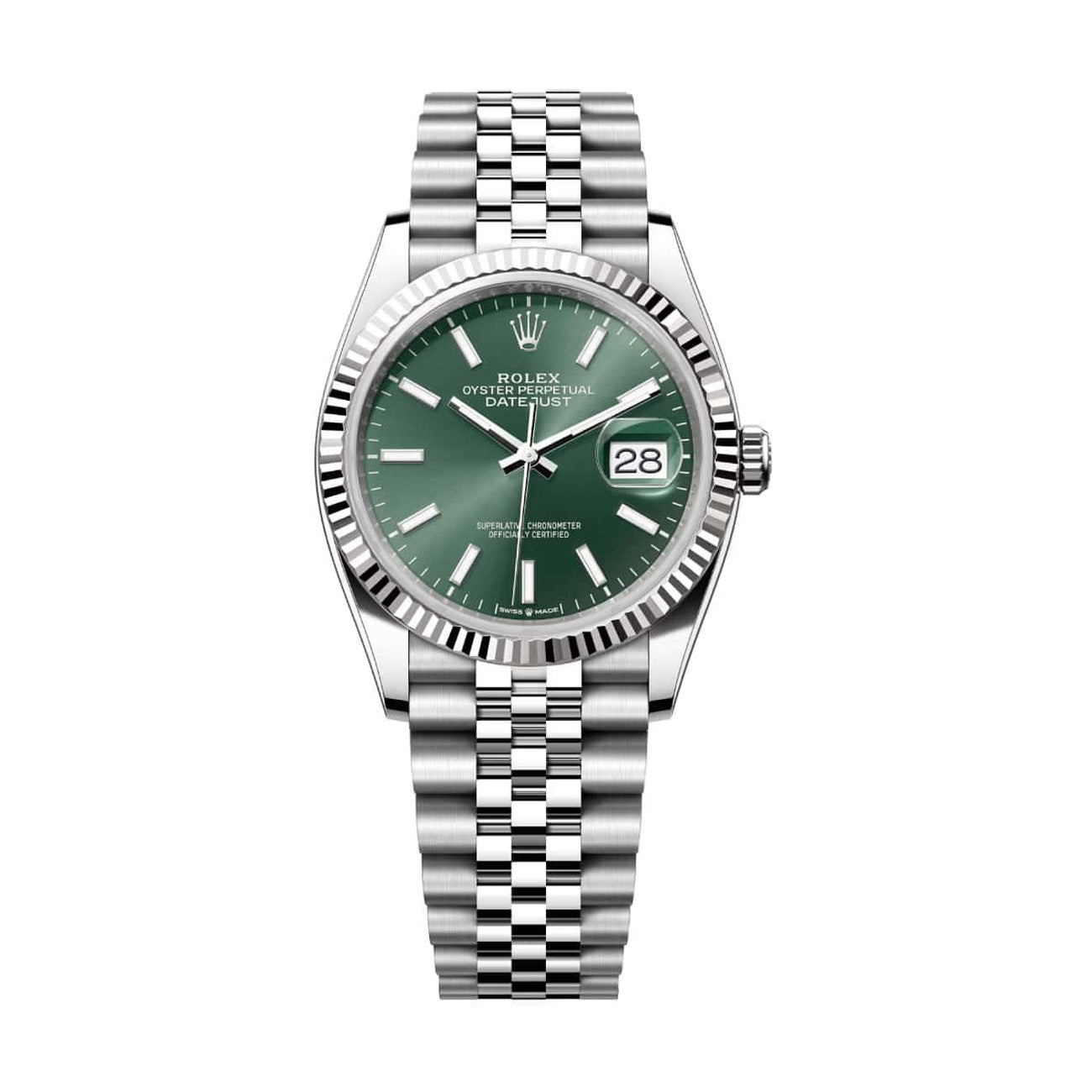 Datejust 36mm1 is a luxurious and elegant wristwatch featuring a striking mint green dial and a classic Jubilee bracelet. With a 36mm Oyster case made of stainless steel and a white gold bezel, it combines durability with sophistication.