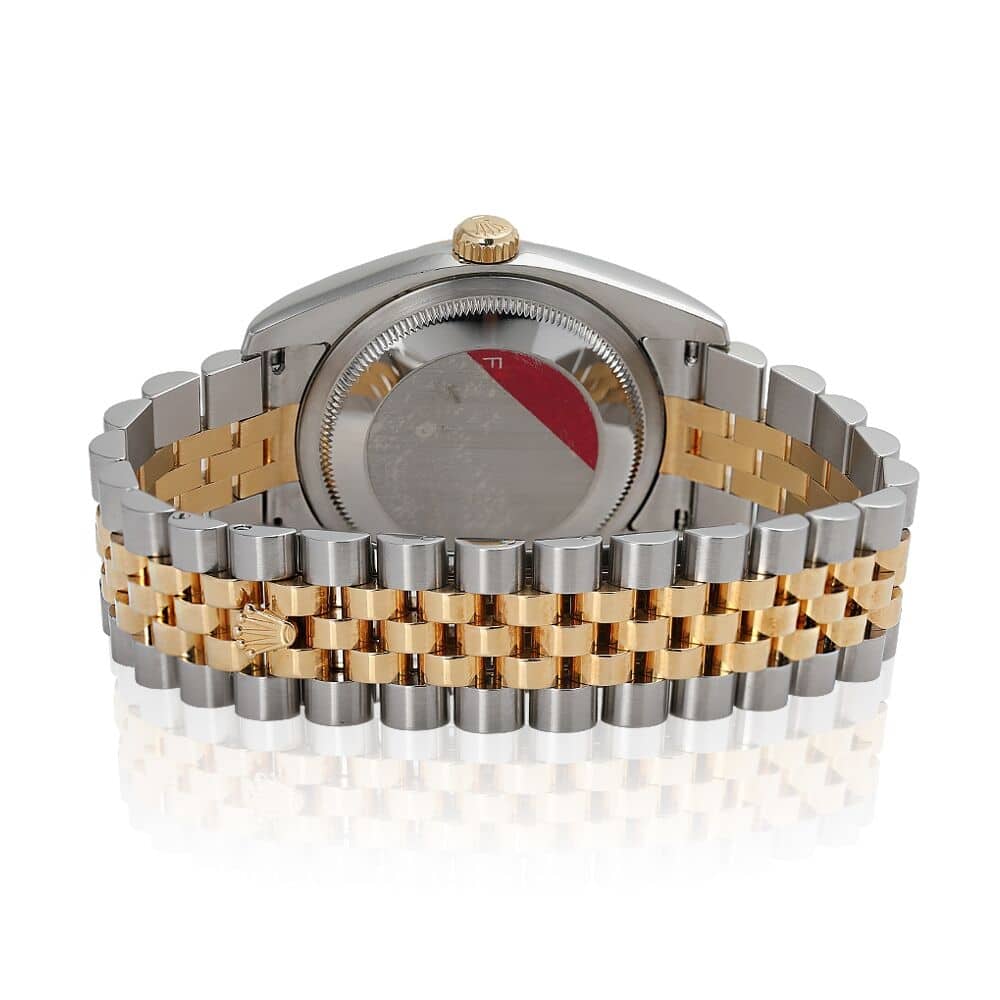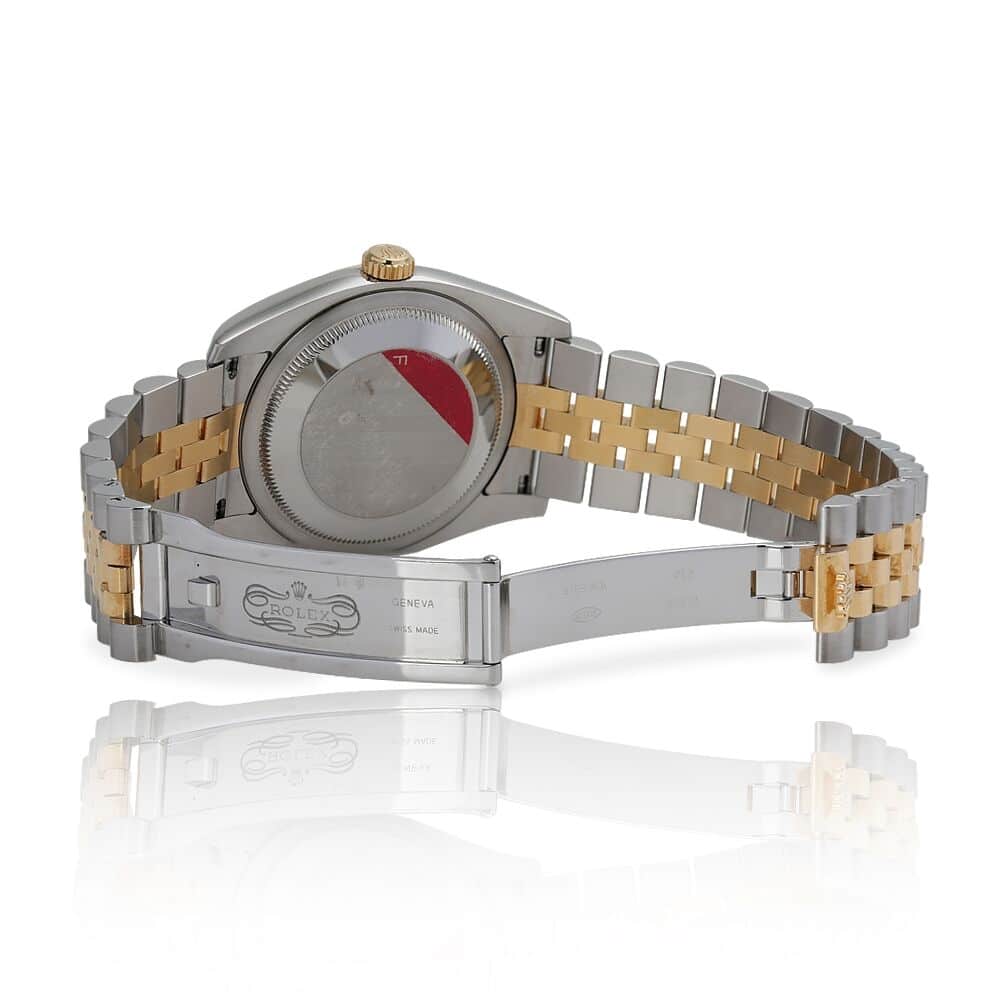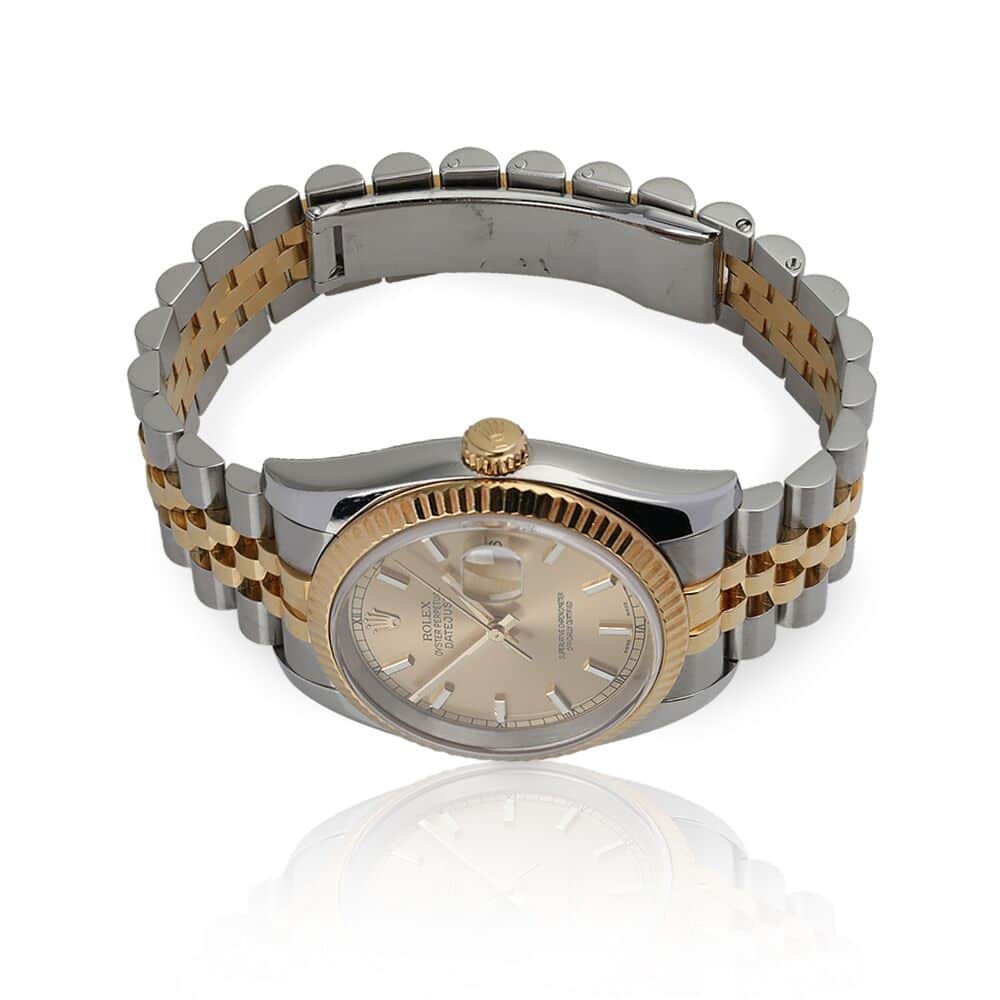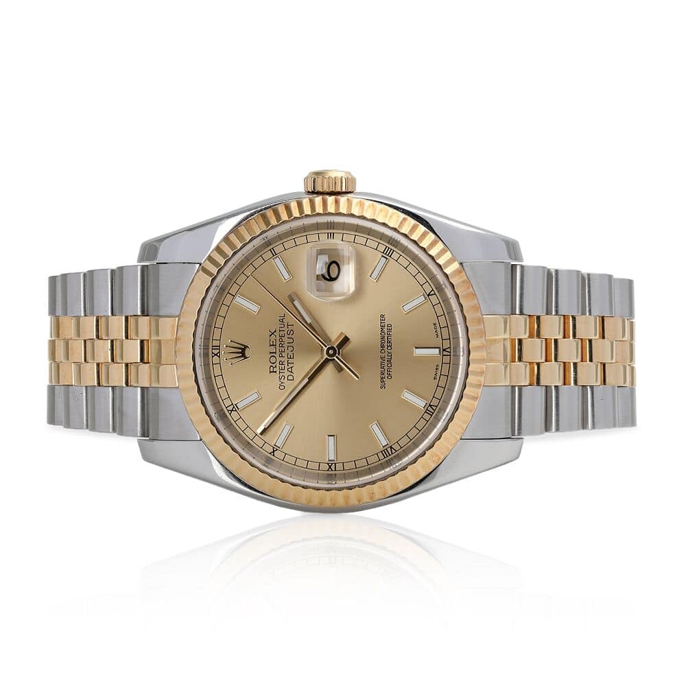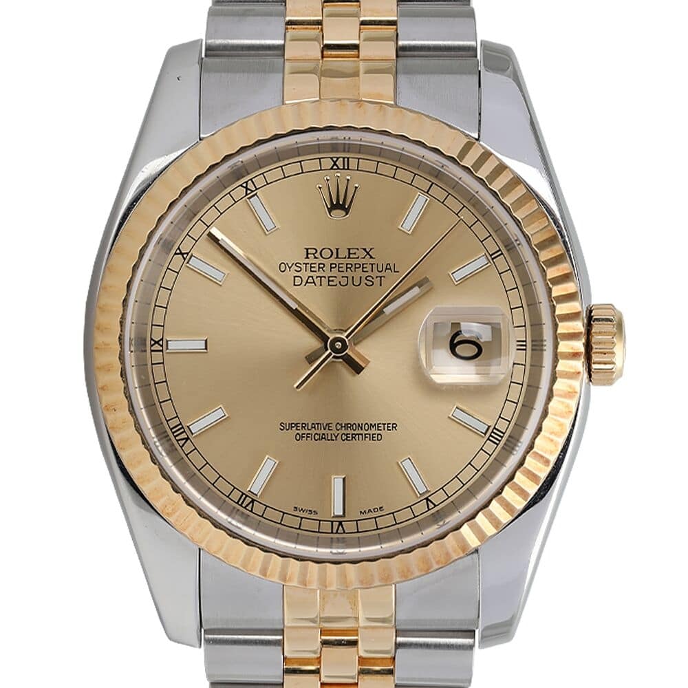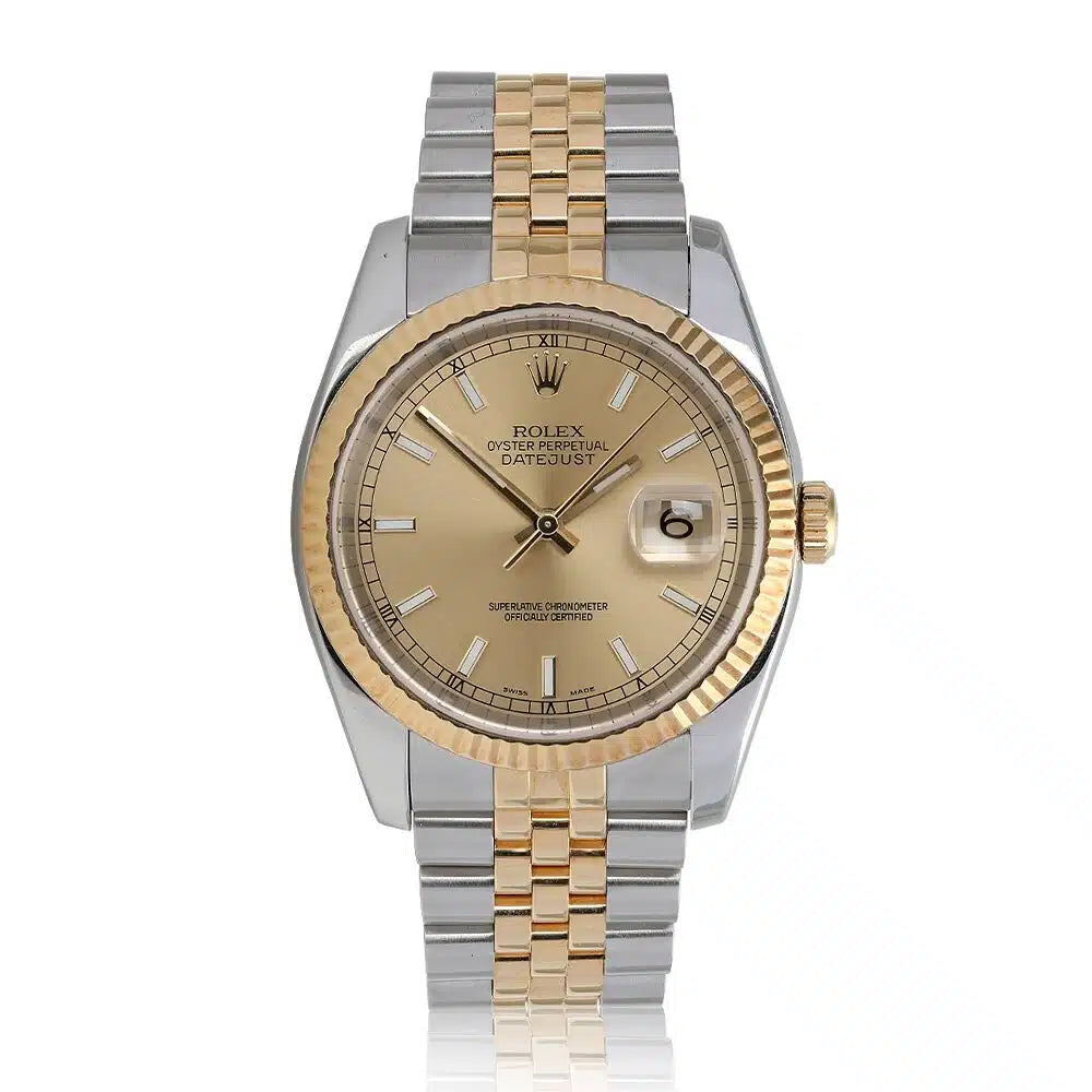 This Rolex Datejust 36mm (Ref. 116233) features a stainless steel and 18k yellow gold case, paired with a Jubilee bracelet. The champagne dial includes gold-tone hands and index hour markers, with a date window at 3 o'clock. Powered by the automatic Caliber 3135 movement, it offers a 48-hour power reserve.