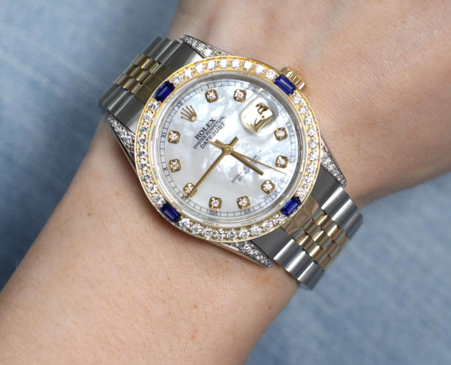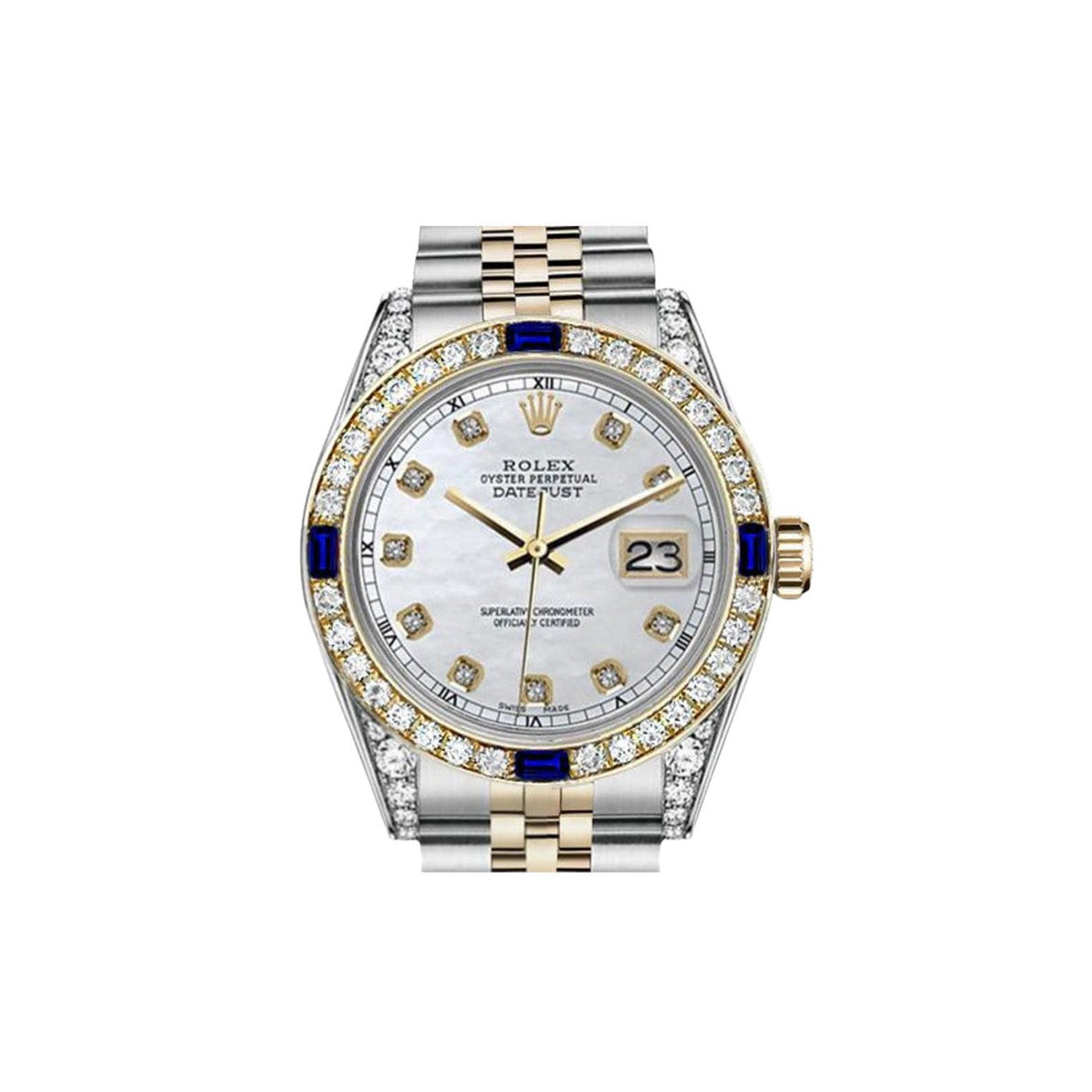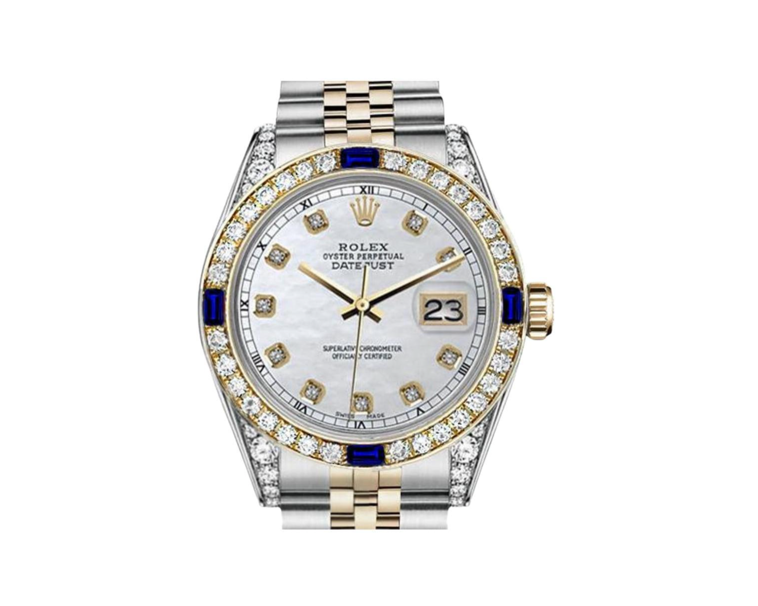 Rolex Datejust 36mm Diamond Bezel & Shoulders White Mother of Pearl Diamond Dial Two Tone Jubilee Watch