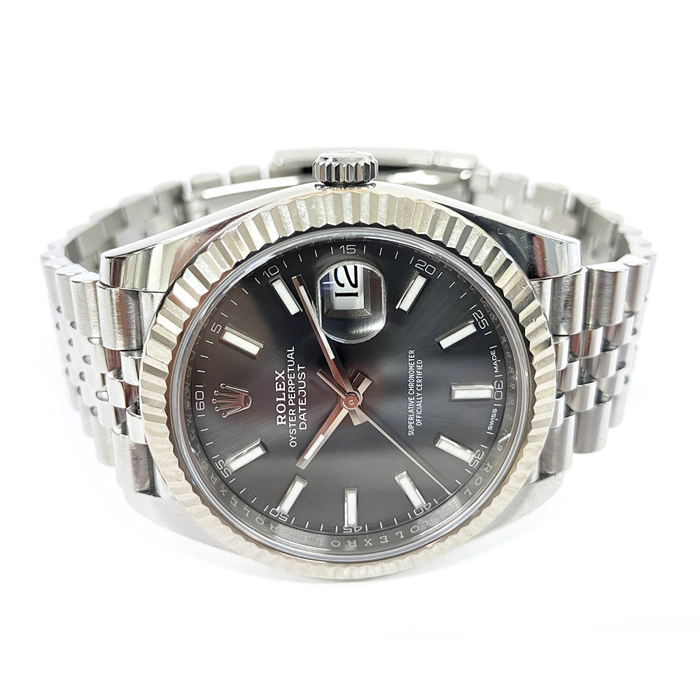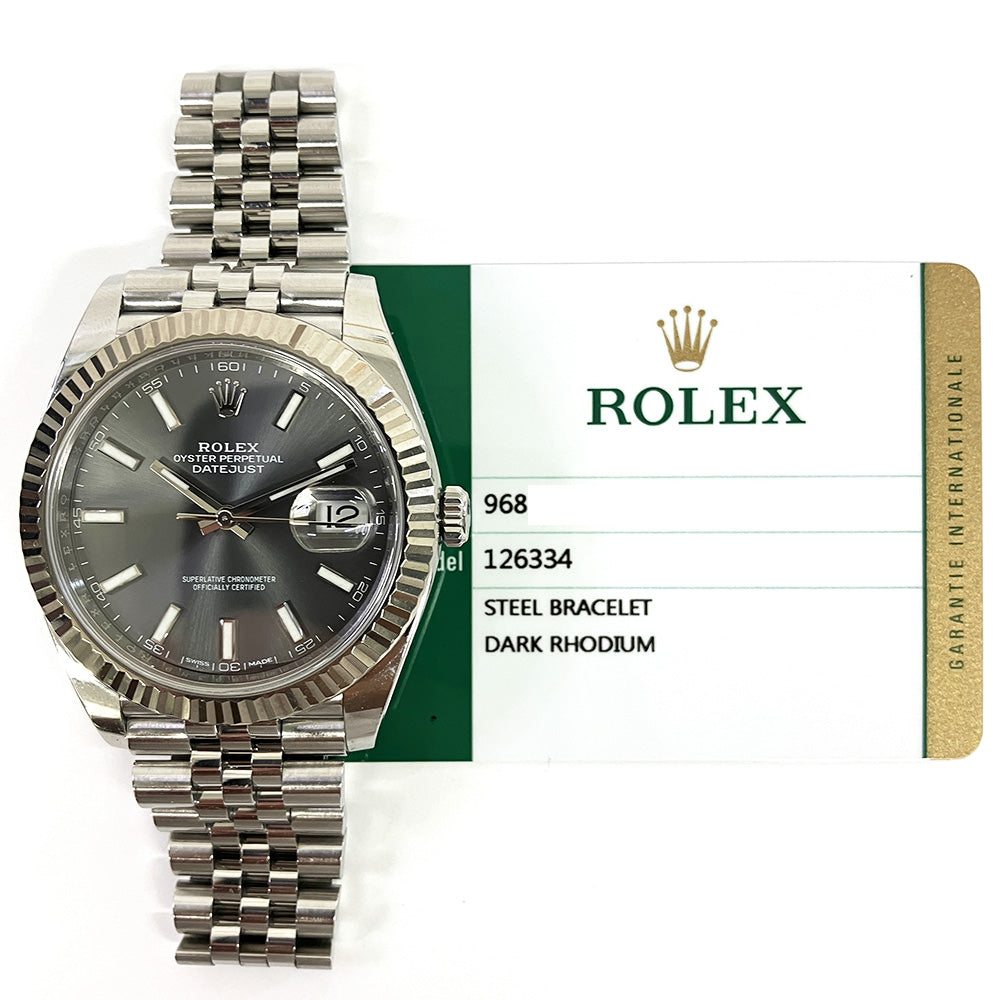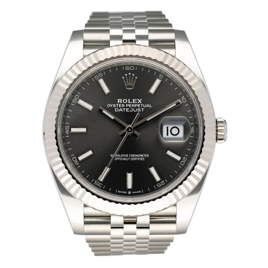 The Rolex Datejust 41, Reference 126334, 41mm stainless steel case. Slate dial with luminescent silver-tone hands and luminescent silver-tone index dial hour markers. Stainless steel bracelet with a fold clasp. Powered by the caliber 3235 automatic movement, the watch offers a 70-hour power reserve and 31 jewels, water-resistant up to 10 ATM. Protected by scratch resistant sapphire crystal. Luxury watch style. Watch label: Swiss Made.