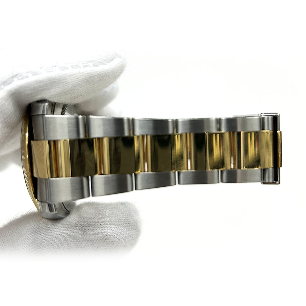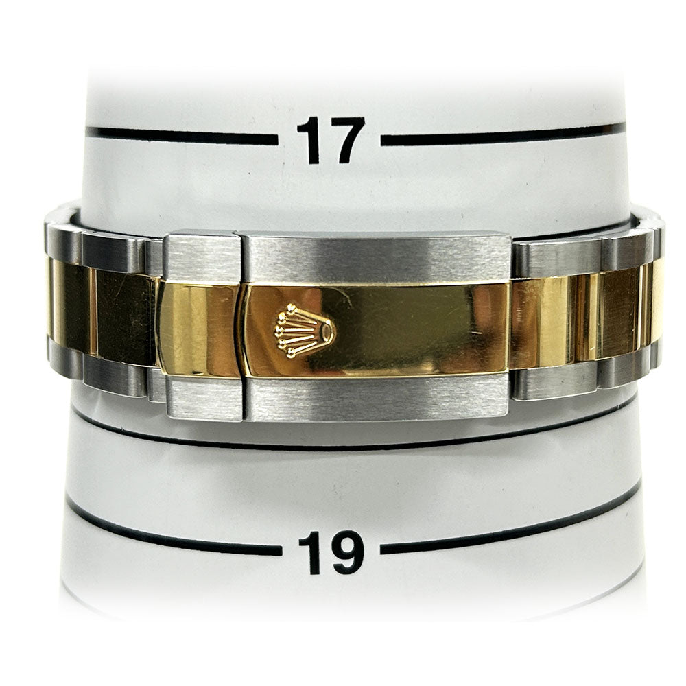 Silver dial, with luminescent yellow gold-tone hands, luminescent yellow gold-tone index hour markers. Rolex calibre 3235 perpetual self-winding movement with date at 3 o'clock that changes instantaneously at midnight in a few thousandths of a second. Approximately 70 hours of power reserve. Yellow Rolesor Oyster bracelet made from a combination of 904L steel and 18K yellow gold with flat three-piece links, folding Oysterclasp buckle with Easylink 5mm comfort extension link. Waterproof to 100 meters. Luxury watch style. Watch label: Swiss made.