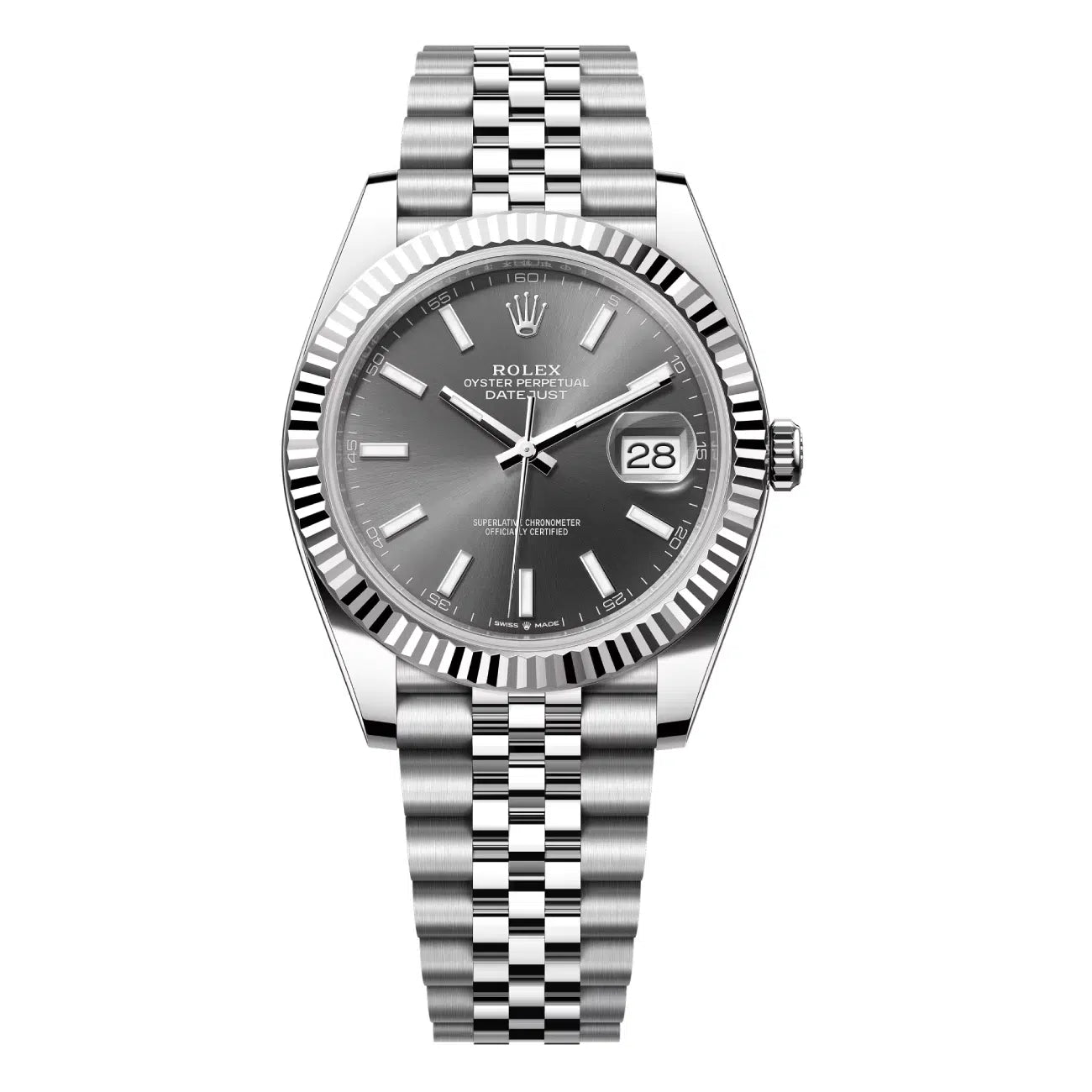 41mm white Rolesor case comprised of a 904L steel monobloc middle case, screw-down steel back, screw-down crown with twinlock double waterproofness system, 18K white gold fluted bezel, scratch-resistant double anti-reflective sapphire crystal with cyclops lens over the date, dark rhodium dial, index hour markers.