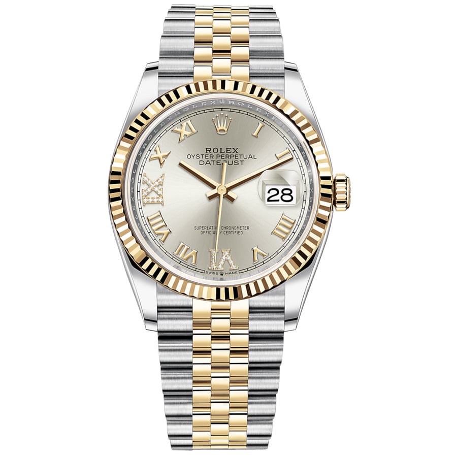 The Rolex Datejust 126233 36mm Stainless steel case with a stainless steel Rolex jubilee bracelet with 18kt yellow gold center links. Fixed fluted 18kt yellow gold bezel. Silver dial with yellow gold-tone hands and roman numeral hour markers paved with diamond at 6 and 9. Dial Type: Analog. Date display at the 3 o'clock position. Rolex calibre 3235 automatic movement, based upon Rolex 3035, containing 31 Jewels, bitting at 28800 vph, and has a power reserve of approximately 70 hours. Scratch resistant sapphire crystal. Screw down crown. Solid case back. Round case shape. Case size: 36 mm. Oyster clasp. Water resistant at 100 meters / 330 feet. Functions: date, hour, minute, second, chronometer. Luxury watch style. Watch label: Swiss made.