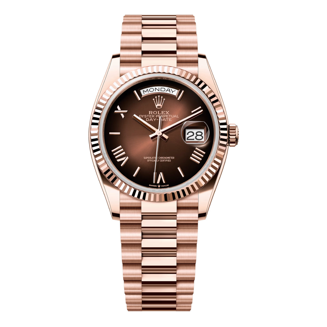 Rolex Day Date 128235-0075 36mm Rose Gold Watch Chocolate Roman Dial 2024