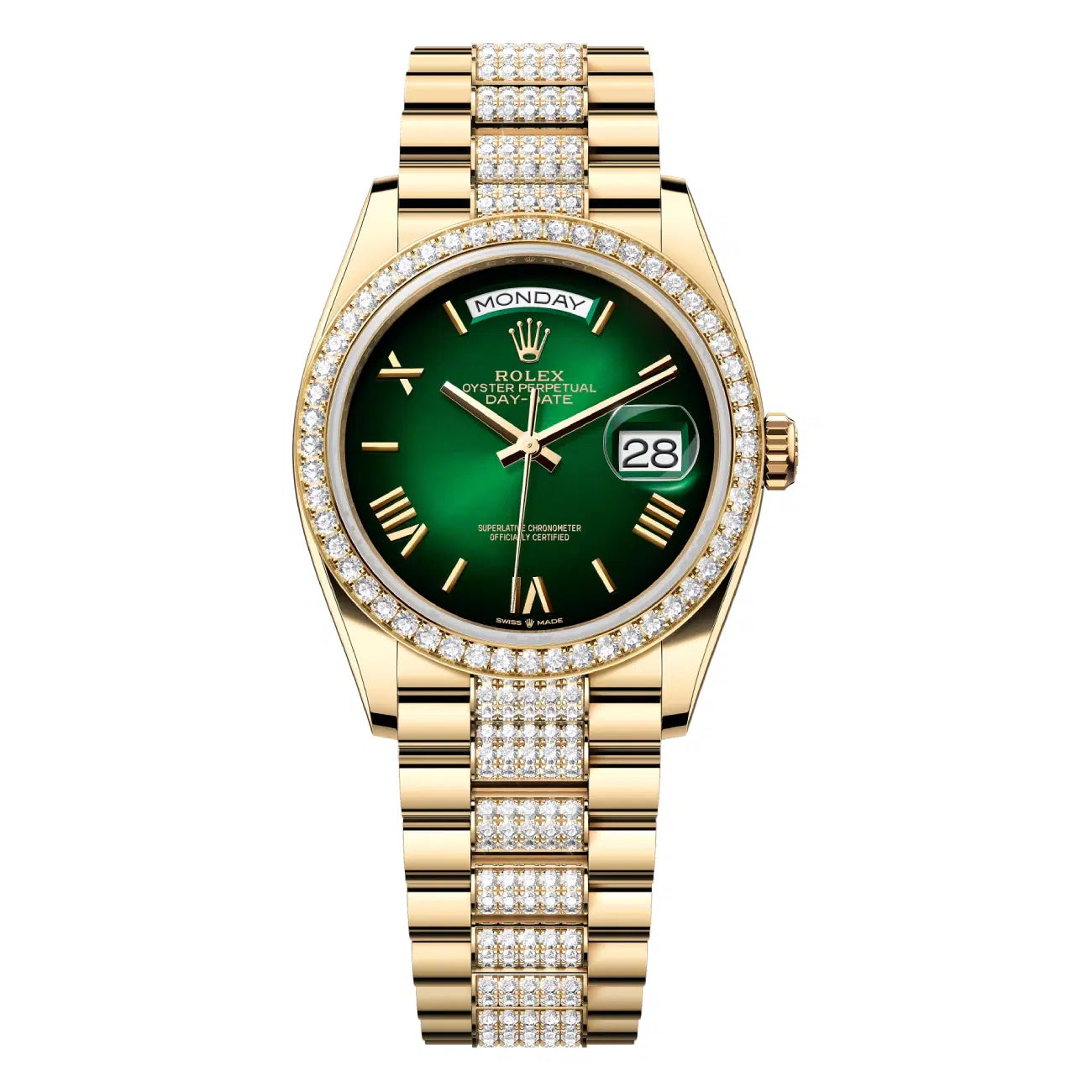 Rolex Day-Date 128348RBR-0069 36mm Yellow Gold with Diamond Bezel & Green ombre Roman Dial 2024
