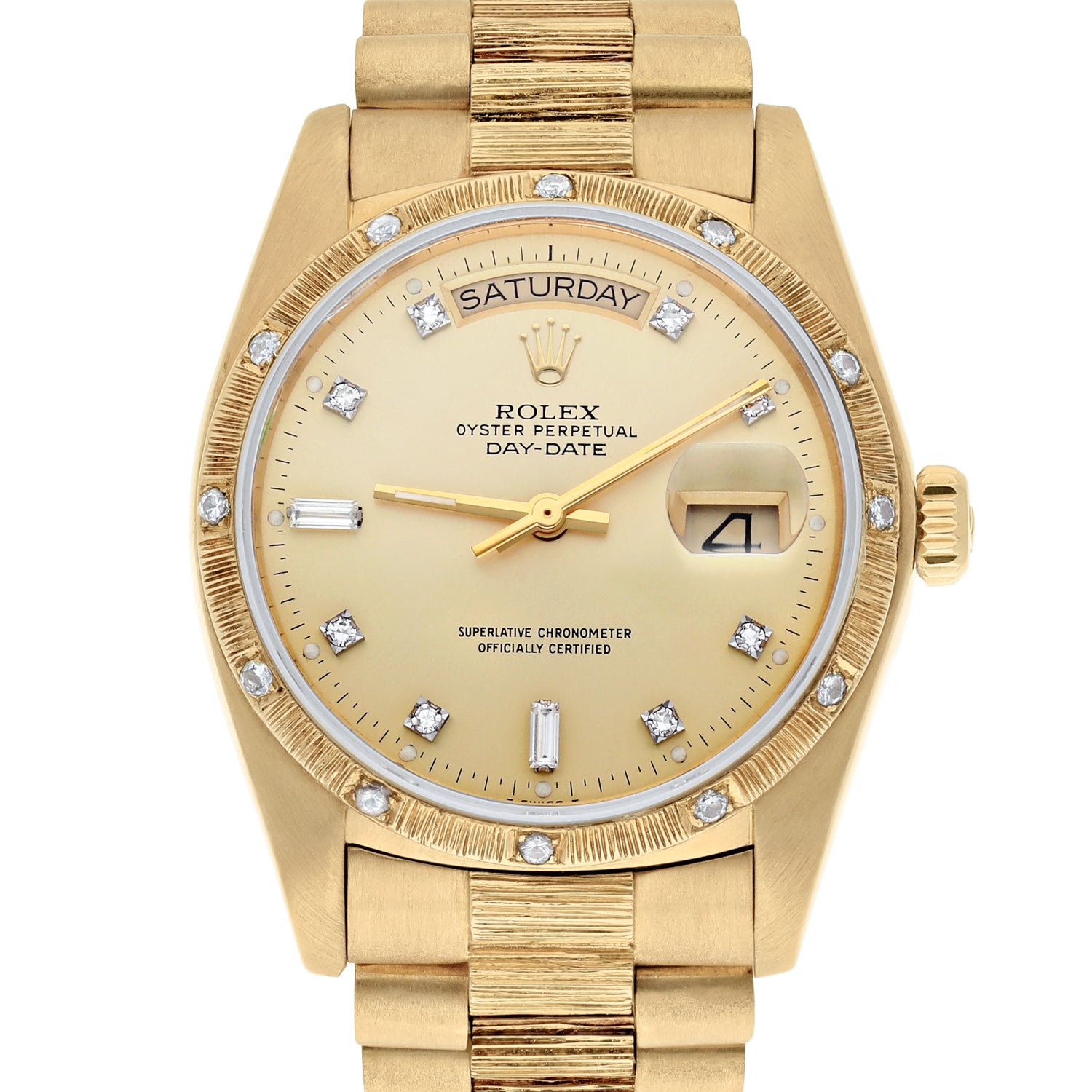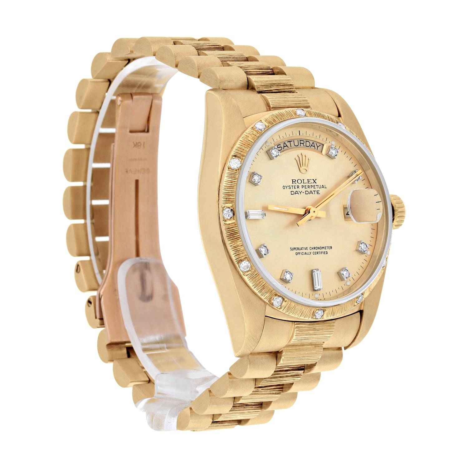 The Rolex Day-Date 18238 is a men's watch featuring a 36mm case crafted from 18K yellow gold, complemented by a fixed bezel of the same material. Its champagne dial showcases gold hands and factory-set diamond hour markers. The date is displayed at the 3 o'clock position, while the day is shown at the 12 o'clock position.
