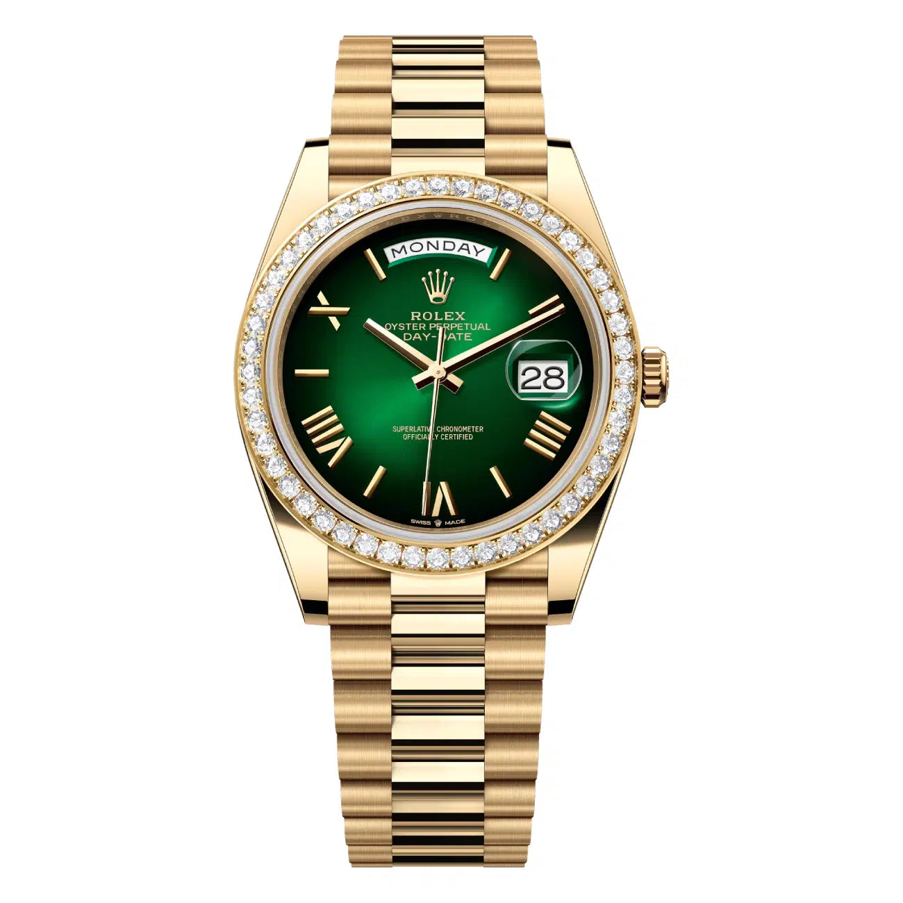 Rolex Day Date 228348TBR-0045 Baguette Bezel Yellow Gold Watch Green Ombre Roman Dial 2024