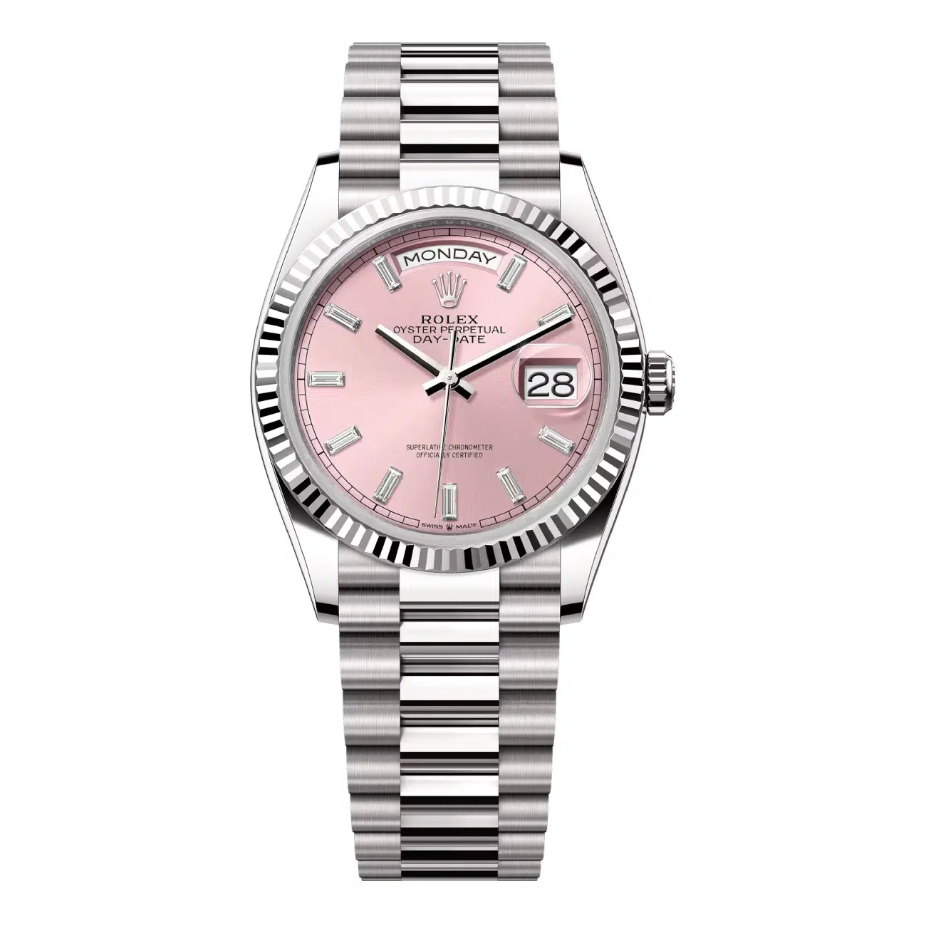 Rolex Day-Date 36mm 128239-0071 White Gold Watch Pink Opal Dial