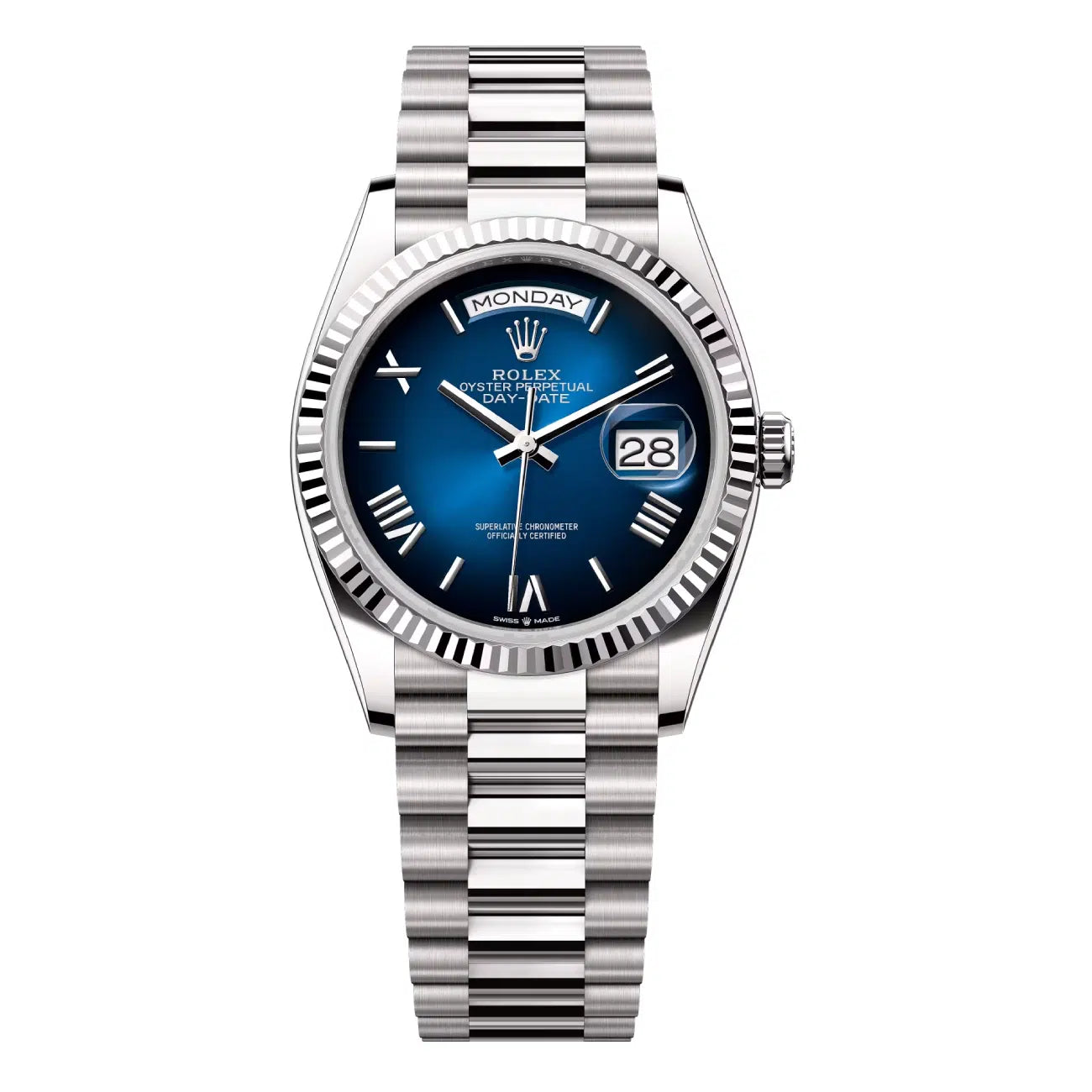 Rolex Day-Date 36mm President 128239-0063 White Gold Watch Blue Ombre Dial 2024