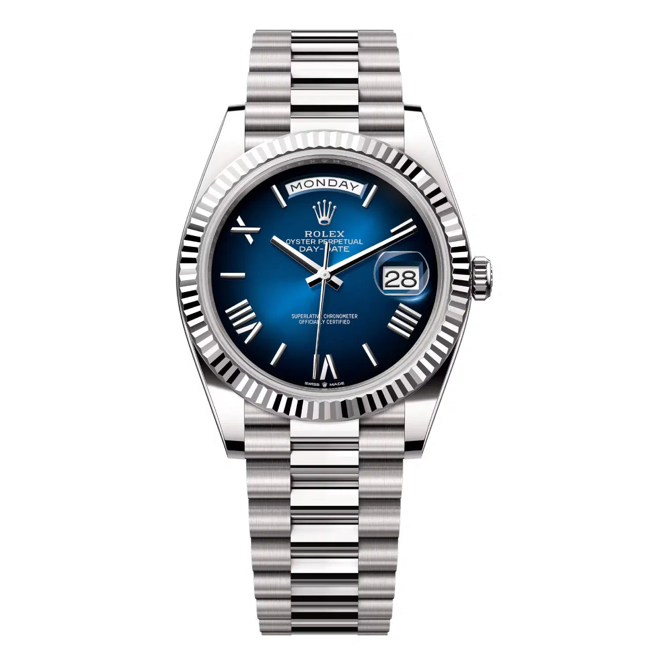 Rolex Day-Date 40mm 228239-0076 White Gold Watch Blue Ombre Roman Dial 2024