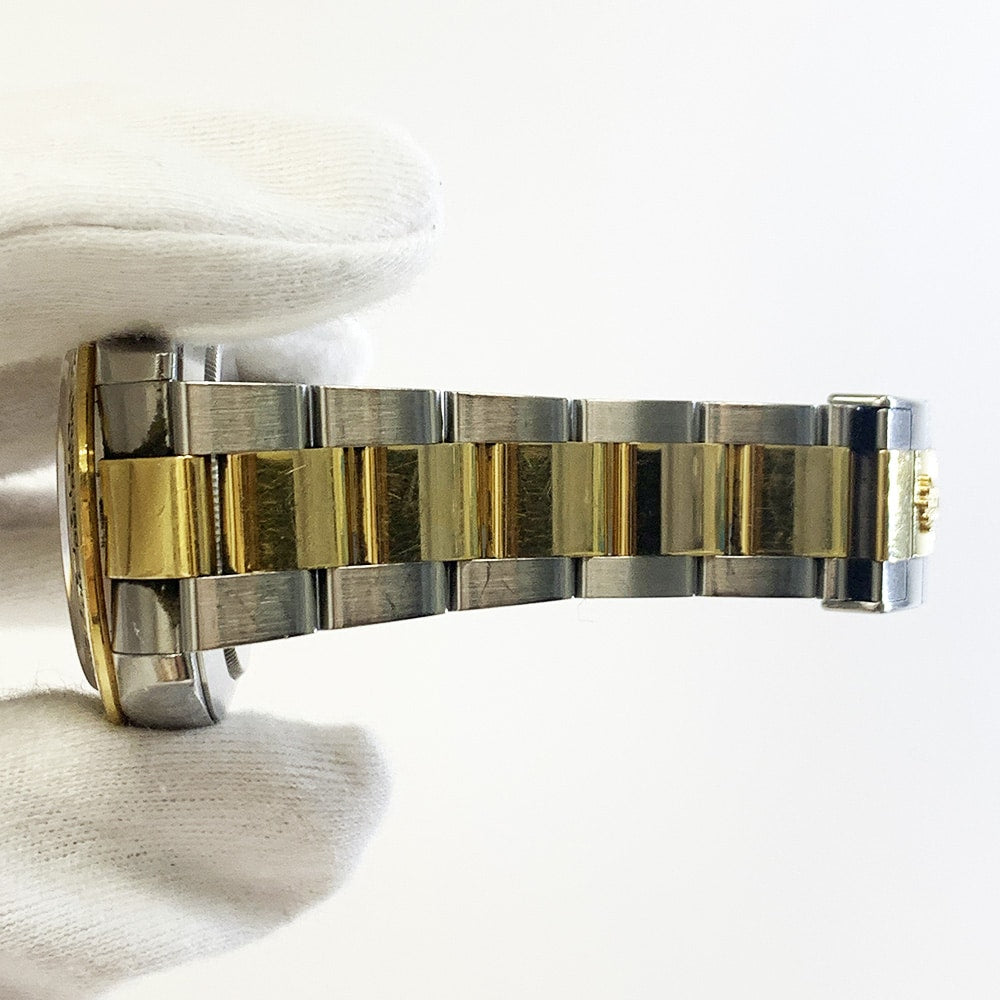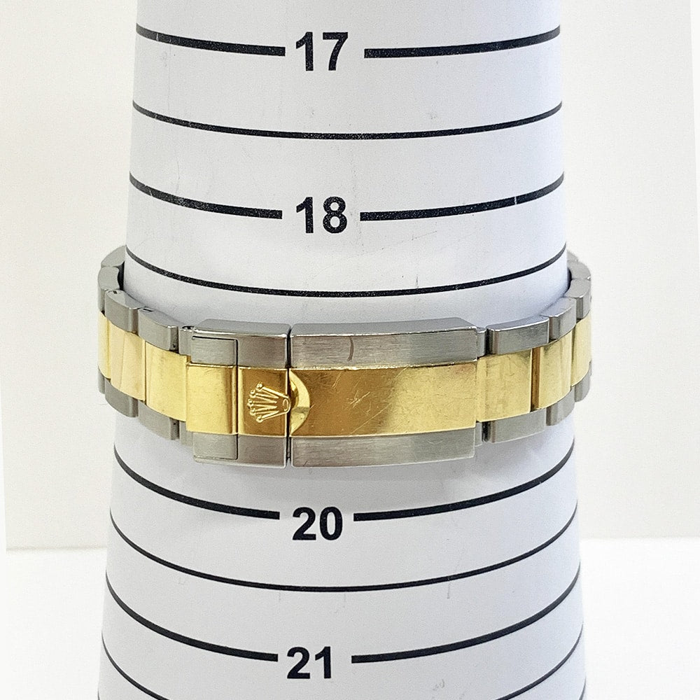 Silver-tone stainless steel case with a two-tone (silver-tone and gold-tone) stainless steel and 18kt yellow gold rolex oyster bracelet. Fixed tachymeter scale 18kt yellow gold bezel. Black dial with gold-tone hands and index hour markers. Minute markers around the outer rim. Dial Type: Analog. Luminescent hands and markers. Chronograph - three sub-dials displaying: 60 second, 30 minute and 1/10th of a second.