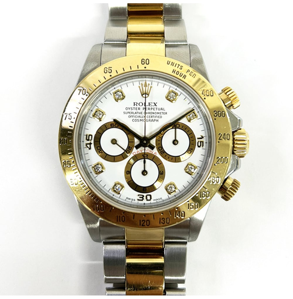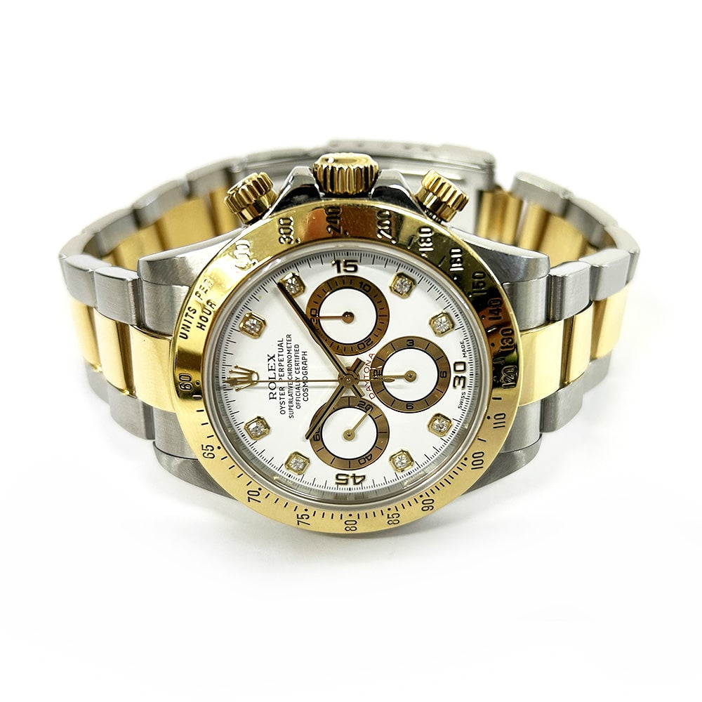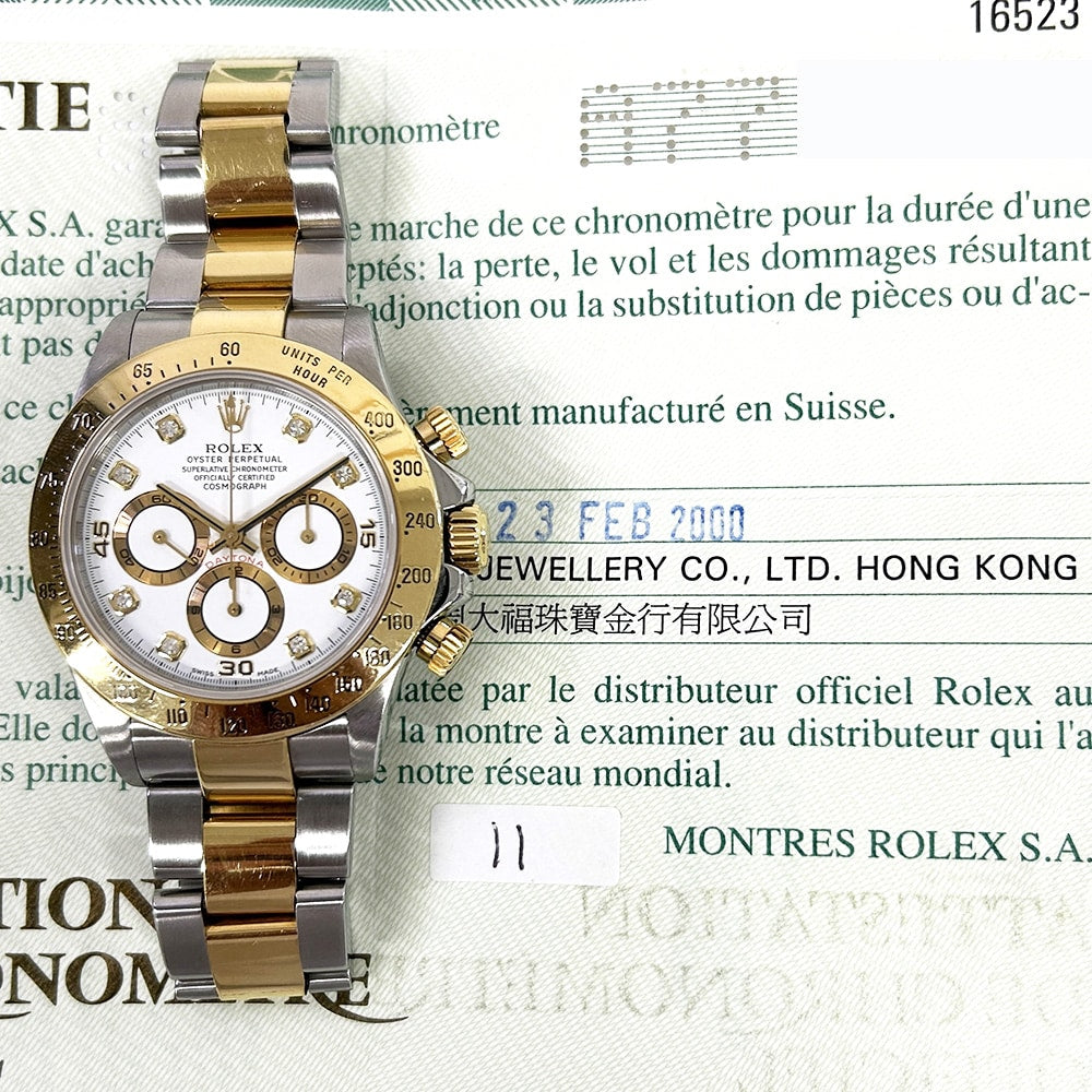 The Rolex Daytona, reference number 16523, 40mm case crafted from gold and steel, complemented by a striking yellow gold bezel. White dial with yellow-tone hands and diamond set hour markers. Two-tone gold and steel bracelet with folded clasp.