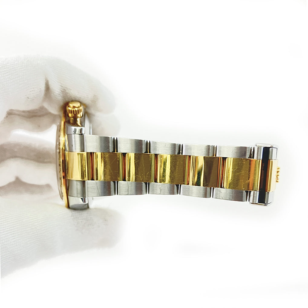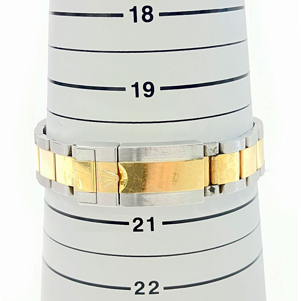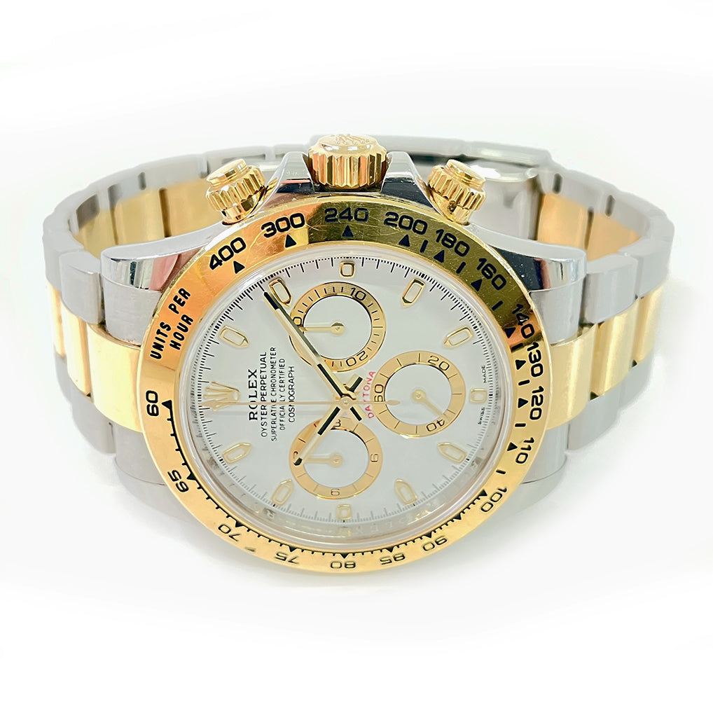Stainless steel case with a stainless steel Rolex oyster bracelet with 18kt yellow gold center links. Fixed 18kt yellow gold bezel with engraved tachymeter markings. White dial with yellow gold-tone hands and luminous stick hour markers. Minute markers around the outer rim. Dial Type: Analog. Luminescent hands and dial markers.