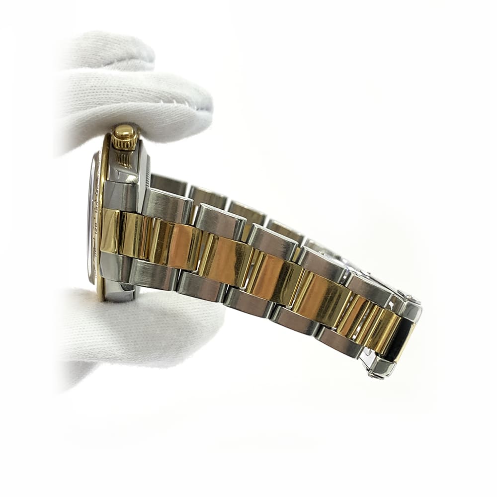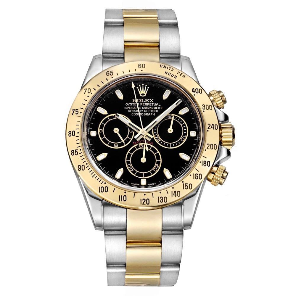 Silver-tone stainless steel case with a two-tone (silver-tone and yellow gold-tone) stainless steel and 18kt yellow gold oyster bracelet. Fixed tachymeter scale yellow gold-tone 18kt yellow gold bezel. Black dial with yellow gold-tone hands and index hour markers. Minute markers around the outer rim. Dial Type: Analog.