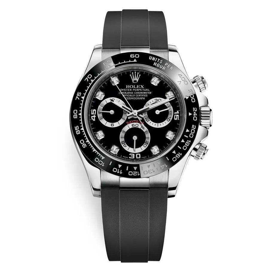 The Rolex Daytona 116519LNG, 40mm white gold case is paired with ceramic bezel. Black dial with luminescent silver-tone hands and diamond set hour markers. Black rubber strap with folded clasp. Powered by the renowned Rolex Caliber 4130 automatic movement, this watch offers superior precision, a 44-jewel configuration. Luxury watch style. Watch label: Swiss Made.